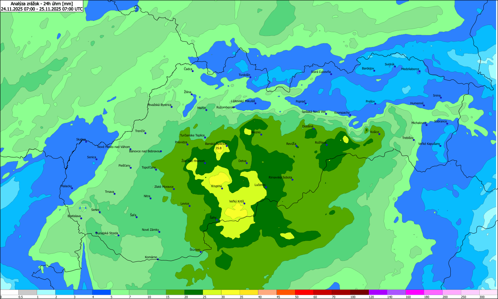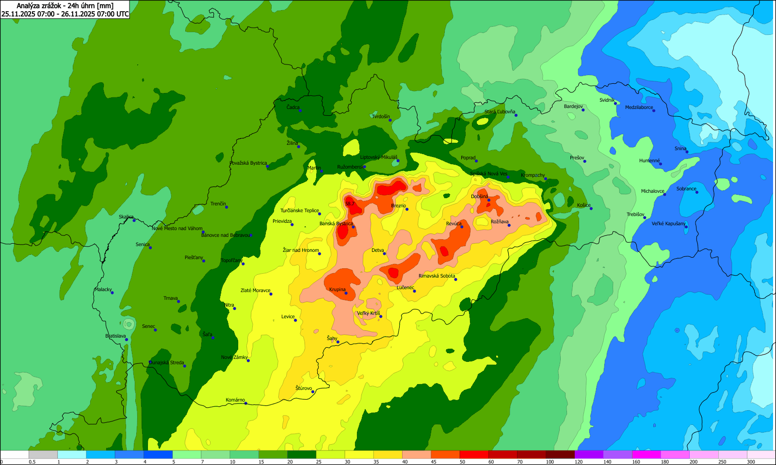 Rekordné denné úhrny úhrny zrážok, z priebežne dostupných údajov, sa sústreďovali 25.11.2025, predovšetkým do južnej polovice stredného Slovenska a priľahlých oblastí na juhozápade východného Slovenska. Mimoriadne vysoké alebo aj rekordné dvojdenné úhrny zrážok v období od 24.11.2025 do 26.11.2025 boli tiež zaznamenané v podobných regiónoch Slovenska. Najvyššie hodnoty týchto charakteristík zrážok sme uviedli v priložených tabuľkách a znázornili v grafických prílohách.