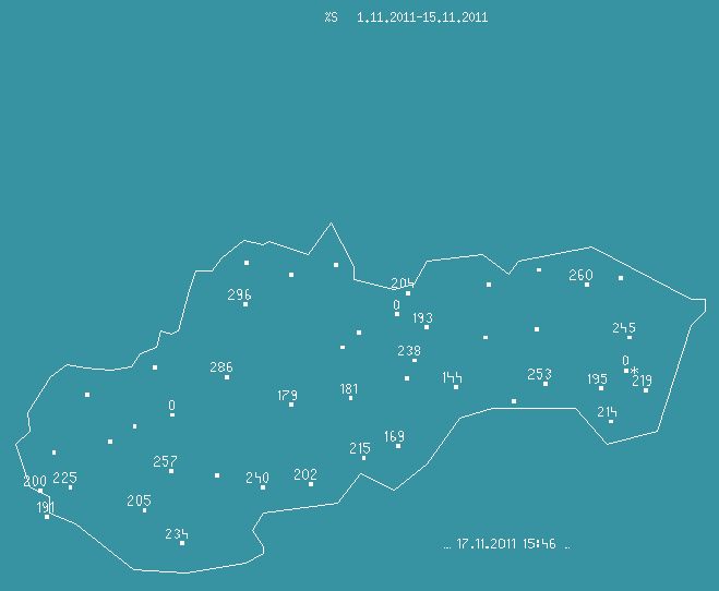 V odbobí od 1. do 15. novembra 2011 bolo na Slovensku skutočne len veľmi málo prípadov dlhšietrvajúcich hmiel či zamračeného počasia, spôsobeného prítomnosťou nízkej oblačnosti. Nejde iba o klamlivé zdanie, ak sa Vám doterajší november javí atypicky slnečný, a nie “dušičkový”... - dĺžkou trvania slnečného svitu je podľa meraní SHMÚ rozhodne nadpriemerný. Väčšina meteorologických staníc na území Slovenska v období 1.-15.11.20011 zaznamenala 1,5 až 3-násobok počtu slnečných hodín ako je pre túto ročnú dobu obvyklé (na obrázku je dĺžka trvania slnečného svitu vyjadrená v precentách normálu z rokov 1961-1990, t.j. 200 znamená 200 % dlhodobého priemeru).