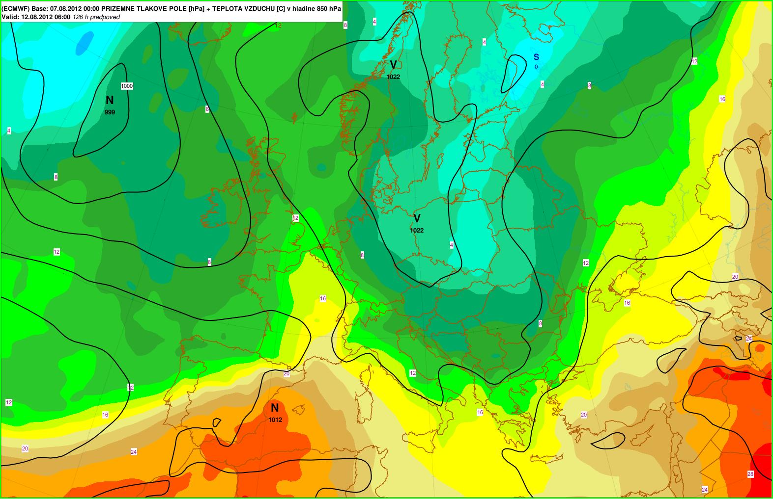 Predpoveď prízemného tlakového poľa a teploty vzduchu v tlakovej hladine 850 hPa, nachádzajúcej sa vo výške cca 1500 m.n.m., na nedeľu 12.8.2012 (zdroj: ECMWF); Pozn.: čierne čiary zobrazujú izobary [hPa] a farebné plochy teplotu vzduchu [˚C].