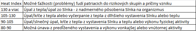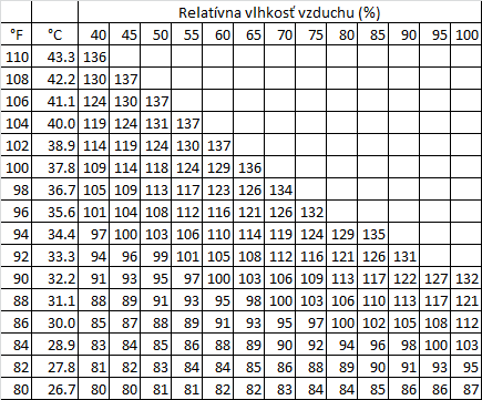 Index tepla (Heat Index) získaný na základe teploty vzduchu a relatívnej vlhkosti: