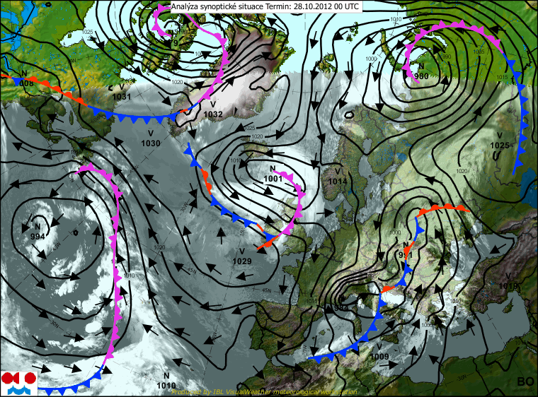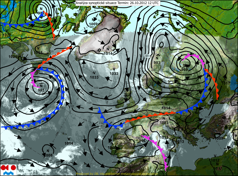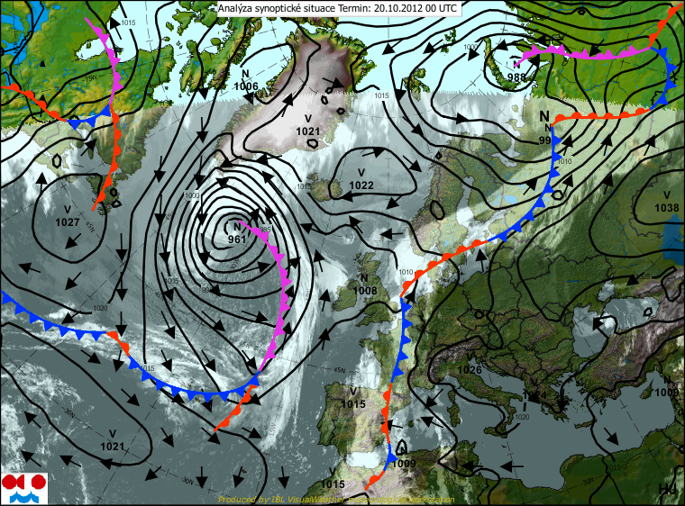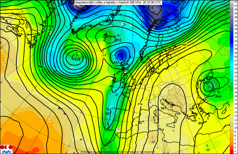 Geopotenciálna výška a teplota vzduchu v hladine 500 hPa (vo výške 5 km) 20.10.2012: