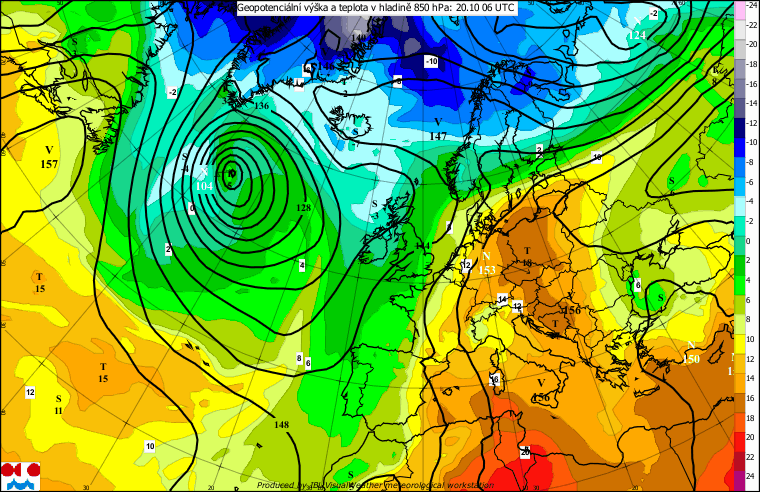 Geopotenciálna výška a teplota vzduchu v hladine 850 hPa (vo výške 1,5 km) 20.10.2012: