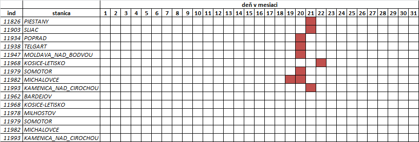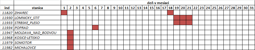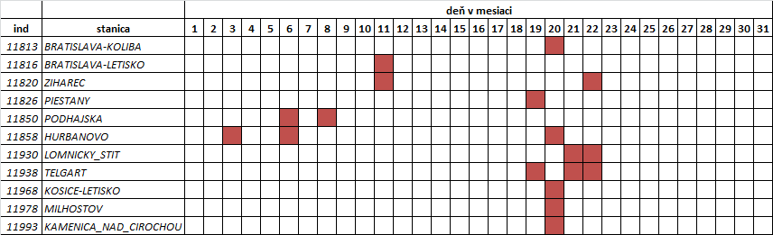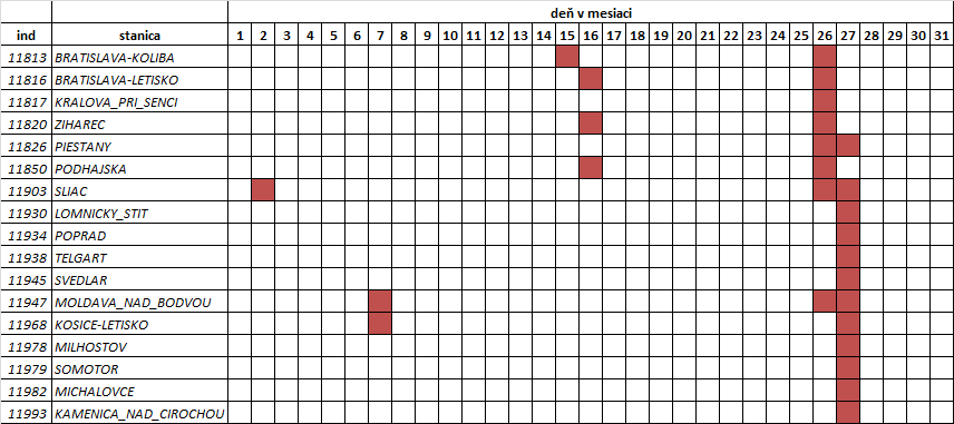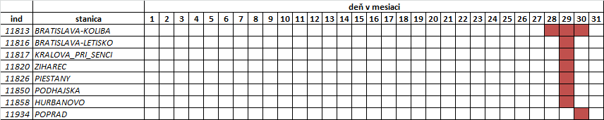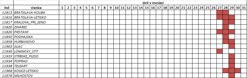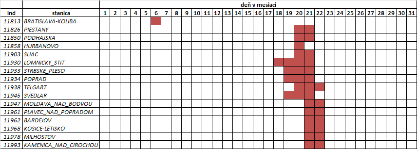 V nasledujúcich tabuľkách sú vyznačené dni kedy bol prekonaný rekord (pozri legendu a mapu staníc nižšie).