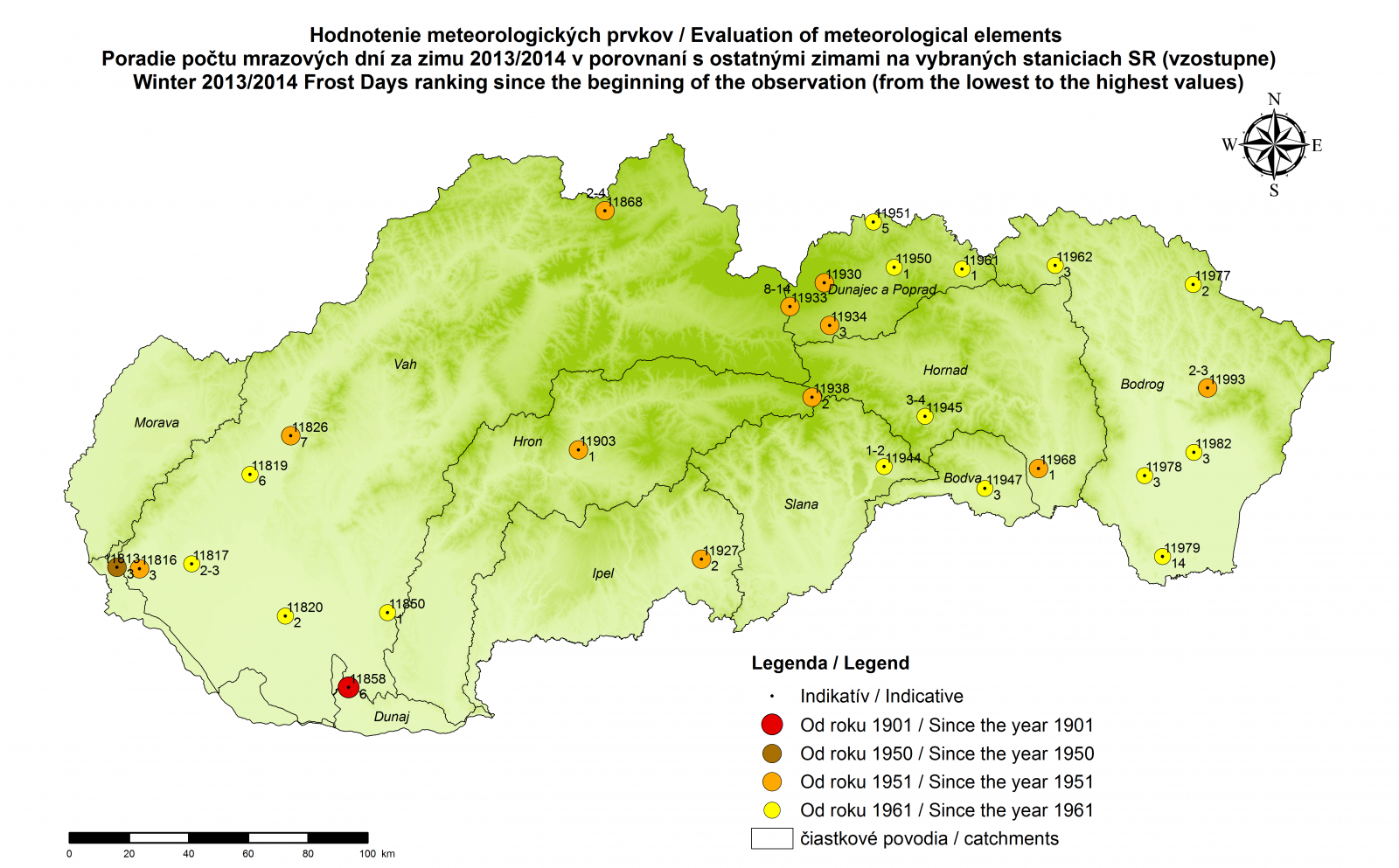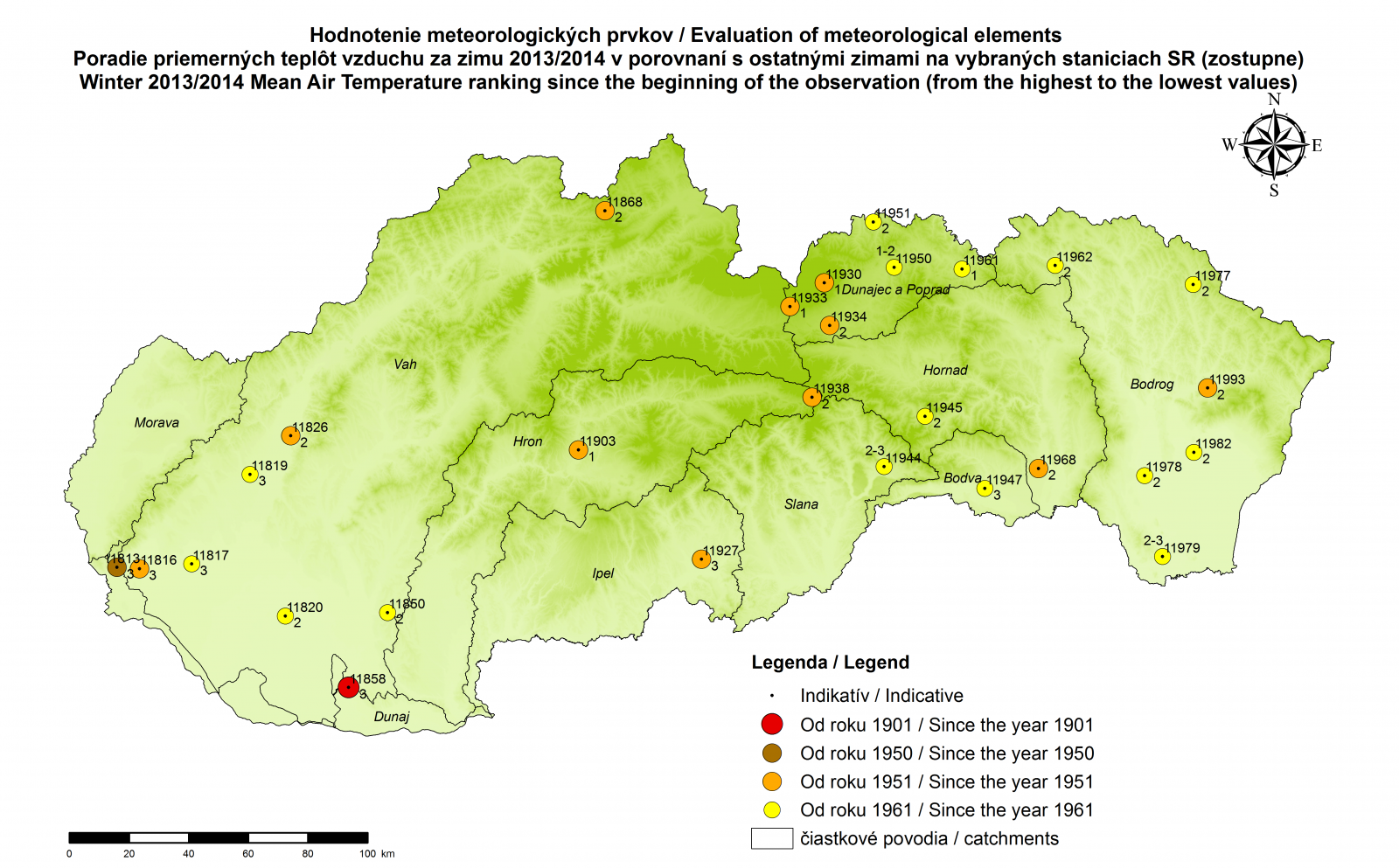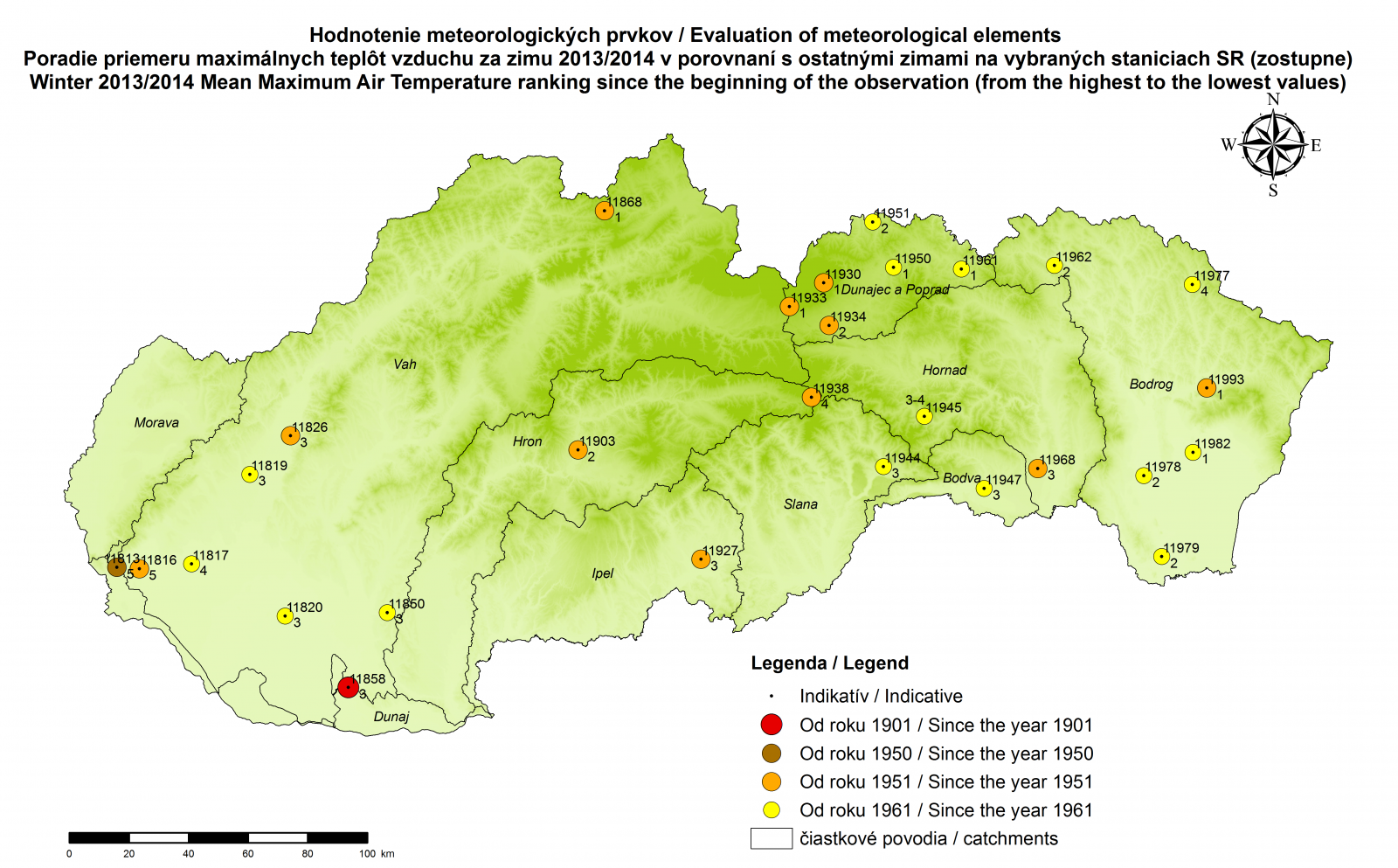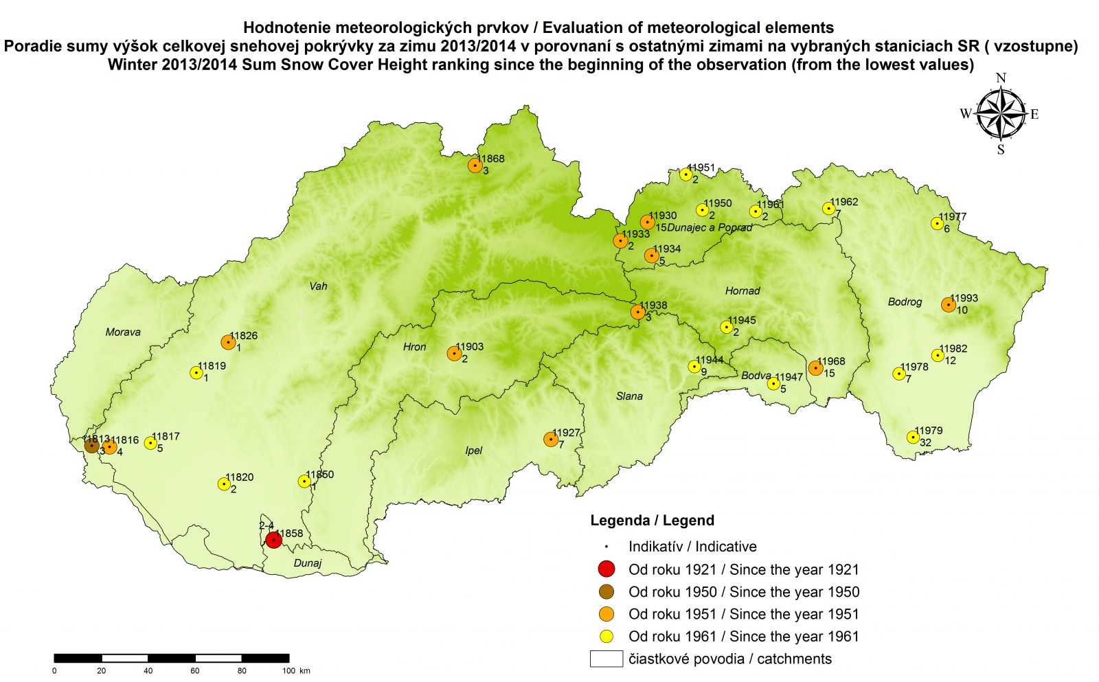 V nasledujúcich mapách uvádzame poradie (zostupne alebo vzostupne) usporiadaných hodnôt meteorologického prvku alebo charakteristiky na vybraných meteorologických staniciach (pozri legendu, označujúcu obdobie hodnotenia zím). Samotná analýza zimy 2013/2014 je v spomenutom príspevku.