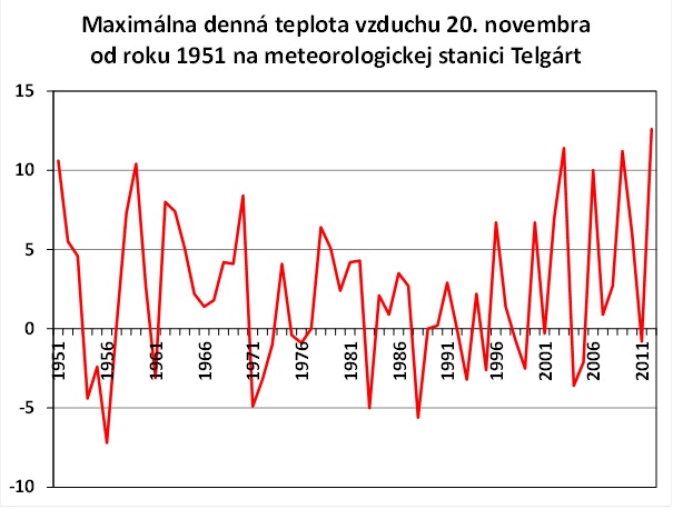V tohtoročnom novembri sme včera (20. novembra 2012) zaznamenali už tretíkrát rekordy maximálnej dennej teploty vzduchu. Po 4. a 11. novembri boli aj včerajšie teploty nadnormálne.