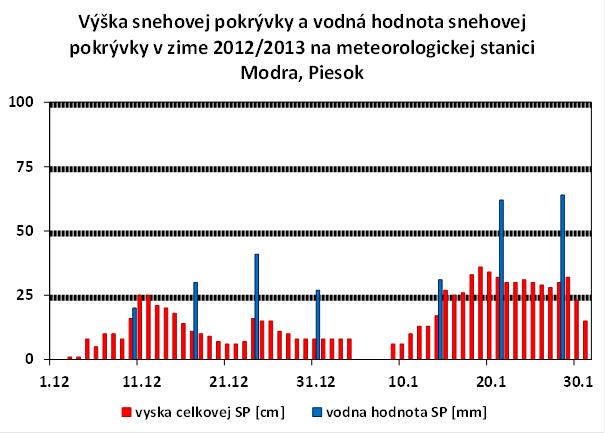 V tohtoročnej zime zásoby vody v snehovej pokrývke z vodohospodárskeho hľadiska v rozhodujúcich oblastiach stredného a severného Slovenska kontinuálne pribúdali a v horských oblastiach v súčastnosti dosahujú v najexponovanejšćih regiónoch (Nízke Tatry, Veľká Fatra, Slovesnké Rudohorie) viac ako 200 mm. V stredných horských polohách v pondelok 28. 1. 2013 napríklad v Lome nad Rimavicou dosiahli zásoby vody v snehovej pokrývke 176 mm pri jej výške 61 cm. V Oravskej Lesnej to bolo 104 mm pri výške snehovej pokrývky 47 cm a v Banskej Štiavnici 130 mm pri výške snehovej pokrývky 48 cm.