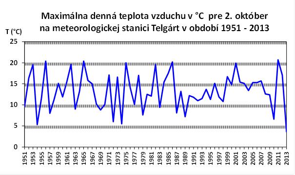 Pozornosť si zaslúži rekordne nízka hodnota maximálnej dennej teploty vzduchu v Telgárte 3,6 °C, pretože tam bol prekonaný 59 rokov starý rekord. K takejto nízkej dennej teplote vzduchu pri advekcii studeného vzduchu od severovýchodu prispelo aj to, že meteorologická stanica v Telgárte je blízko sedla Besník, v ktorom sa pri týchto poveternostných situáciách zosilňuje rýchlosť vetra. Ak potom preniká pri vyššej rýchlosti vetra studený vzduch na Horehronie, môže mať aj takéto ochladzovacie účinky. Hodnoty maximálnej dennej teploty vzduchu v Telgárte od roku 1951 pre 2. október môžete vidieť v grafickej prílohe.