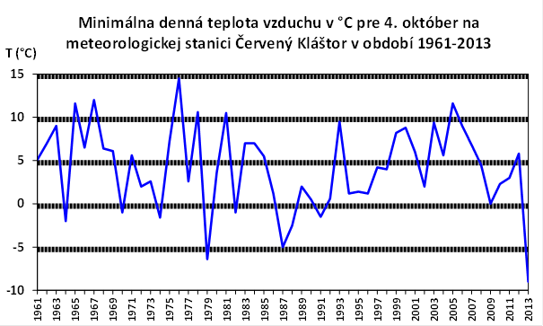 Na grafe je vidieť, že v Červenom Kláštore klesla teplota vzduchu 4. októbra od roku 1961 do záporných hodnôt iba 8-krát.