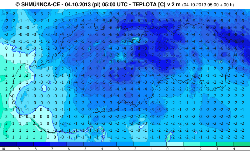 Tak sa aj stalo. Advekcia studeného vzduchu sa na väčšine územia Slovenska najvýraznejšie prejavila práve v piatkové ráno 4.10. Na približne dvoch tretinách meteorologických staníc s denným spravodajstvom bola zaznamenaná rekordne nízka teplota vzduchu. Najnižšie klesla teplota vzduchu na týchto meteorologických staniciach: