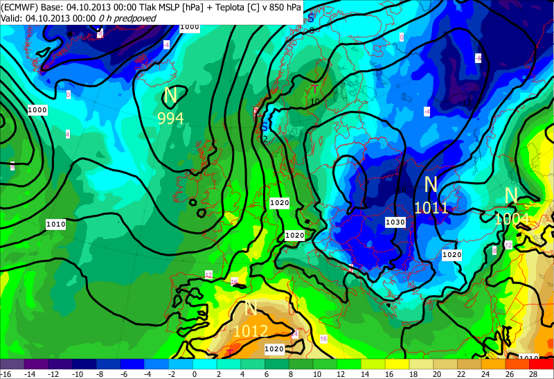 Modelová analýza prízemného tlakového poľa (čierne izočiary) a teploty vzduchu v hladine 850 hPa (cca nadmorská výška 1500 m) 4.10.2013 2:00 LSEČ.
