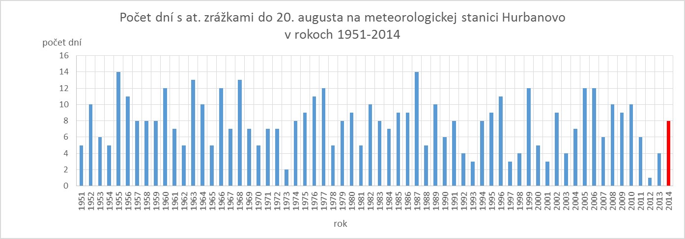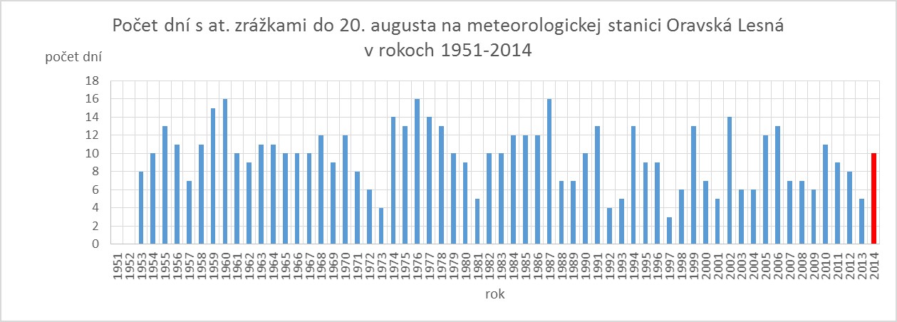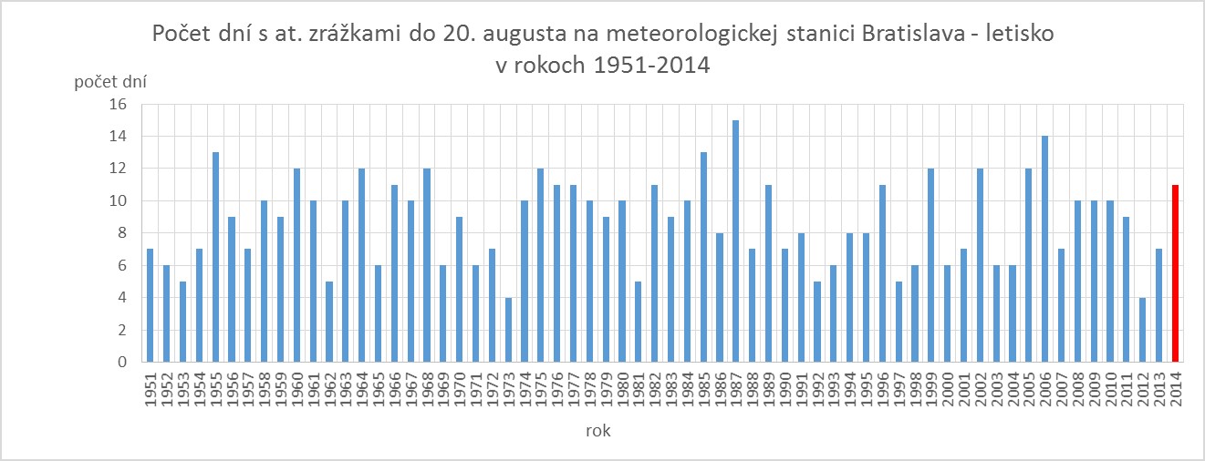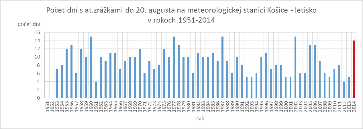 Pri analýze počtu dní s at. zrážkami boli spracované časové rady pozorovaní od roku 1951 – 2014 pre vybrané meteorologické stanice v jednotlivých častiach Slovenska. V sledovanom časovom období augusta 2014 sme doteraz zaznamenali na meteorologickej stanici Bratislava – letisko 11 dní (obr.1), kedy padali at. zrážky, v Hurbanove to bolo 8 dní (obr.2), v Oravskej Lesnej to bolo 10 dní (obr.3) a meteorologická stanica Košice – letisko zaznamenala 14 dní (obr.4) so zrážkami. Ako vidieť z jednotlivých grafov ani na jednej meteorologickej stanici nešlo o najvyšší počet dní s at. zrážkami v tomto období. Bratislava – letisko namerala najvyšší počet dní so zrážkami v roku 1987, v Hurbanove to bolo v rokoch 1955 a 1987, v Oravskej Lesnej v rokoch 1960, 1976 a 1987 a v Košiciach na letisku v rokoch 1960, 1977, 1987 a 2002.