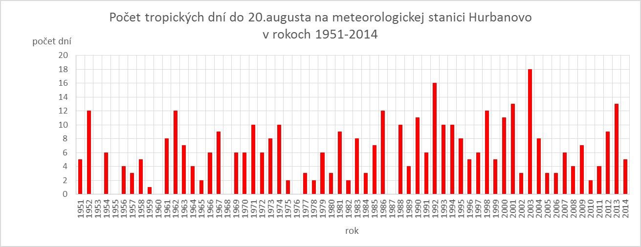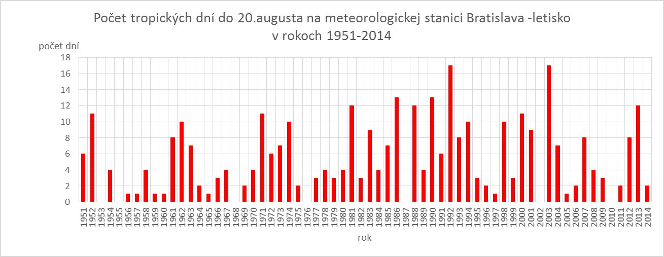 V tejto analýze by som chcel poukázať na vývoj počtu dní s atmosférickými zrážkami a počtu tropických dní od 1. do 20. augusta v rokoch 1951-2014, pretože mohlo by sa zo súčasného trendu vývoja počasia v jednotlivých augustových dňoch zdať, že august tohto roka je z hľadiska týchto dvoch ukazovateľov výnimočným mesiacom.