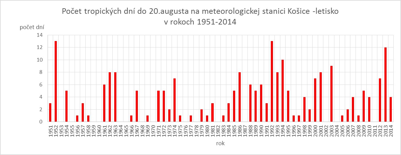 Ďalej boli spracované v rovnakom časovom intervale v prvých dvoch dekádach augusta aj počty tropických dní v rokoch 1951-2014. Tropický deň je z meteorologického hľadiska definovaný ako deň, kedy maximálna teplota vzduchu dosiahne 30 °C a viac. Nasledovné grafy ukazujú, že ani v tomto smere sa august 2014 nejaví ako abnormálny mesiac. Na meteorologickej stanici Bratislava – letisko boli namerané 2 tropické dni (obr.5). Takýto počet tropických dní sa však vyskytol aj v rokoch 1964, 1969, 1975, 1996, 2006 a 2011. No napriek tomu sme zaznamenali roky, v ktorých sme mali menej ako dva tropické dni a dokonca v roku 1953 a 1987 nebol nameraný ani jeden tropický deň v sledovanom období. Podobná situácia je aj pri porovnaní časových radov meteorologickej stanice Hurbanovo (obr.6) a Košice – letisko (obr.7).