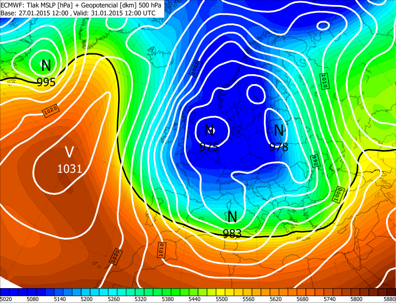 Obr. 1 - Predpoveď prízemného tlakového poľa (biele izočiary) a geopotenciálu hladiny 500 hPa (farebná škála), ktorá reprezentuje vyššie vrstvy troposféry; model ECMWF, 31.1.2015 12:00 UTC.