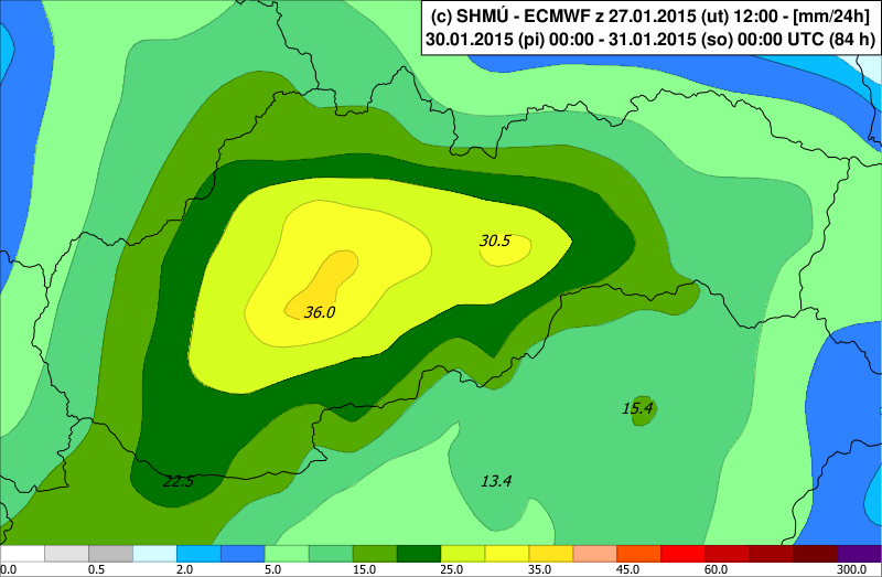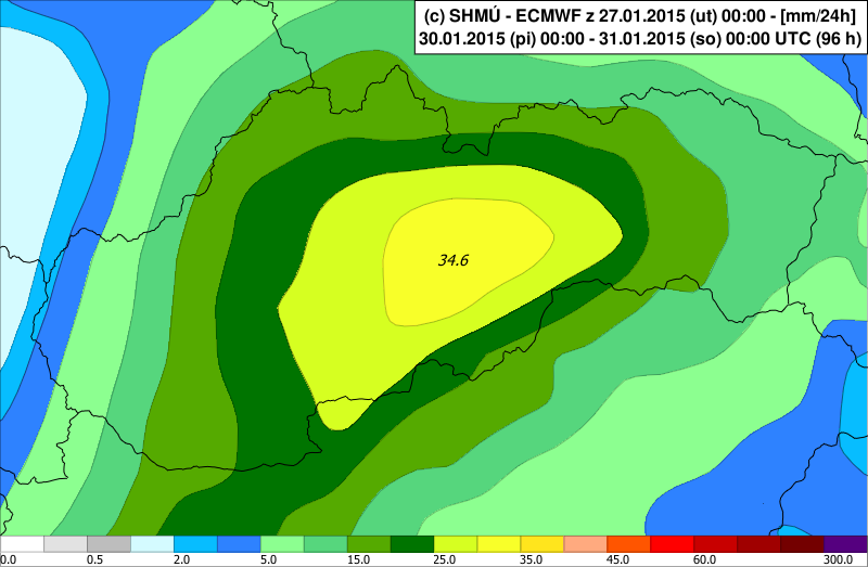 Obr. 2 - Predpoveď 24-hodinových úhrnov zrážok pre piatok 30.1.2015 z modelu ECMWF.