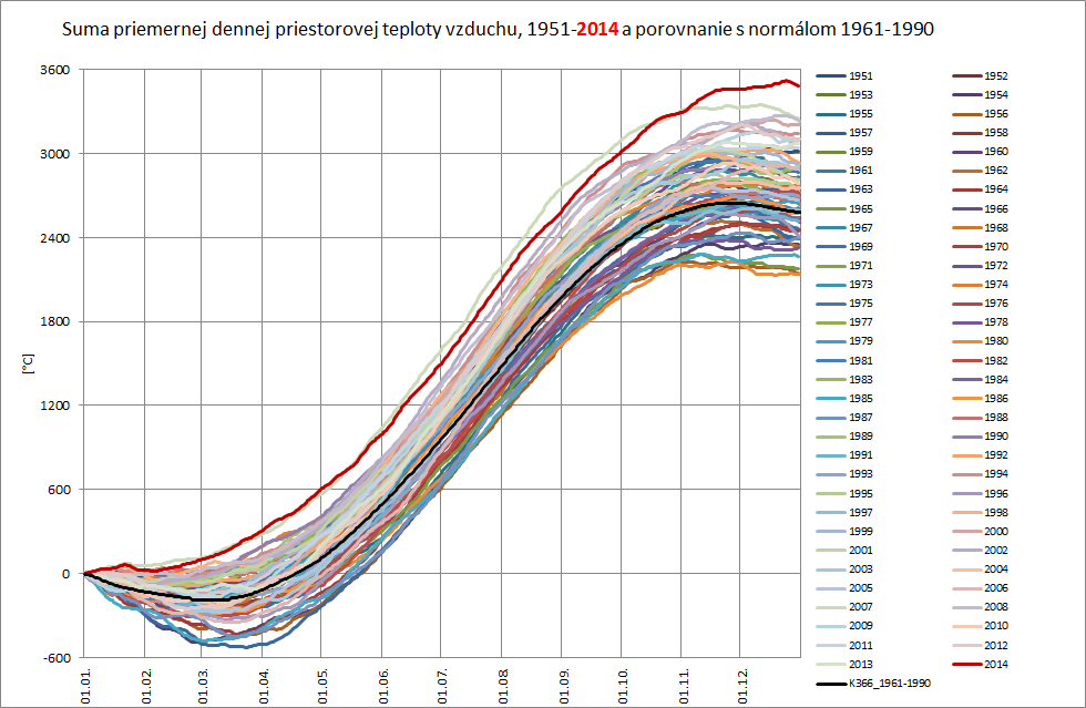 Priebeh kumulovaných hodnôt priemernej dennej teploty vzduchu v ročnom chode počas jednotlivých rokov (z vybraného počtu staníc predstavujúce priestorovú charakteristiku) počnúc 1951 a končiac 2014 je na obr. 1. Rok 2014 (výrazne červená krivka) potvrdil, že i pri použití takéhoto postupu spracovaniu denných teplôt vzduchu sa ukázal ako najteplejší v histórii merania teploty vzduchu na území Slovenska.
