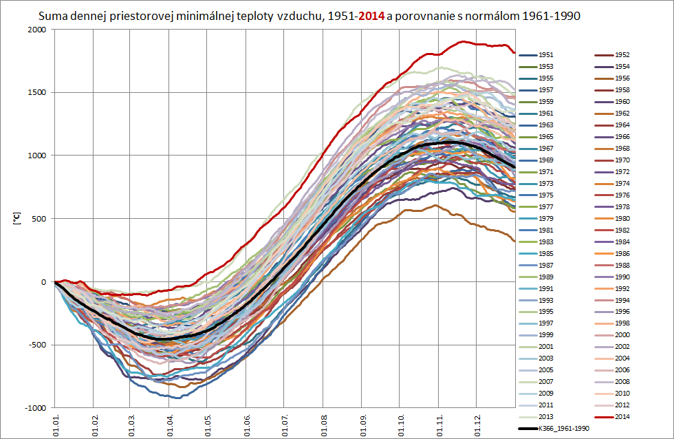 Z uvedeného spracovania vyplýva, že k rekordnej sume priemernej dennej teploty vzduchu potvrdzujúcej najteplejší rok 2014 prispeli najmä mesiace (v poradí od začiatku roka) január, február, ale najmä rekordne teplý marec a tiež veľmi teplý november. Je treba poznamenať, že počas celého roka 2014 boli hodnoty kumulovanej priemernej dennej teploty vzduchu nadnormálne vysoké (v závere mesiaca), len máj a august boli chladnejšie stále však, i keď málo, nad normálom (1961-1990) v obrázkoch hladká krivka čiernej farby v strede ostatných čiar.