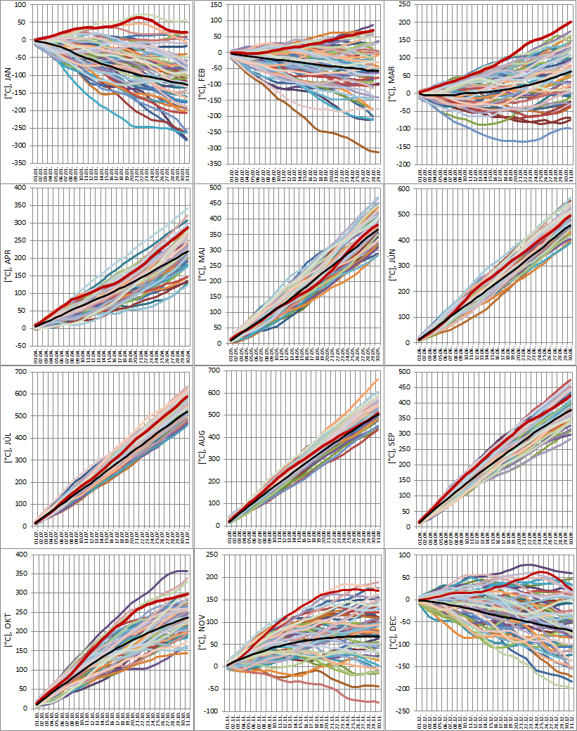 Pre stanovenie prírastku alebo úbytky na chod kumulovaných denných hodnôt teploty vzduchu počas roka, má rozhodujúci vplyv najmä mesačný priebeh (séria obrázkov 2.1 až 2.12). Pre stanovenie významu každého jedného mesiaca je stanovenie počiatku prírastku (úbytku) prvým dňom (resp. priemernou dennou teplotou prvého dňa konkrétneho mesiaca) a následnou sumáciou až po jeho koniec (mesačný priebeh).