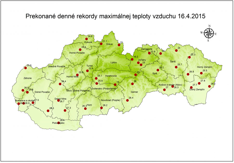 Dňa 16.4.2015 na mnohých miestach Slovenska boli prekonané denné rekordy maximálnej teploty vzduchu (Obr. 1).
