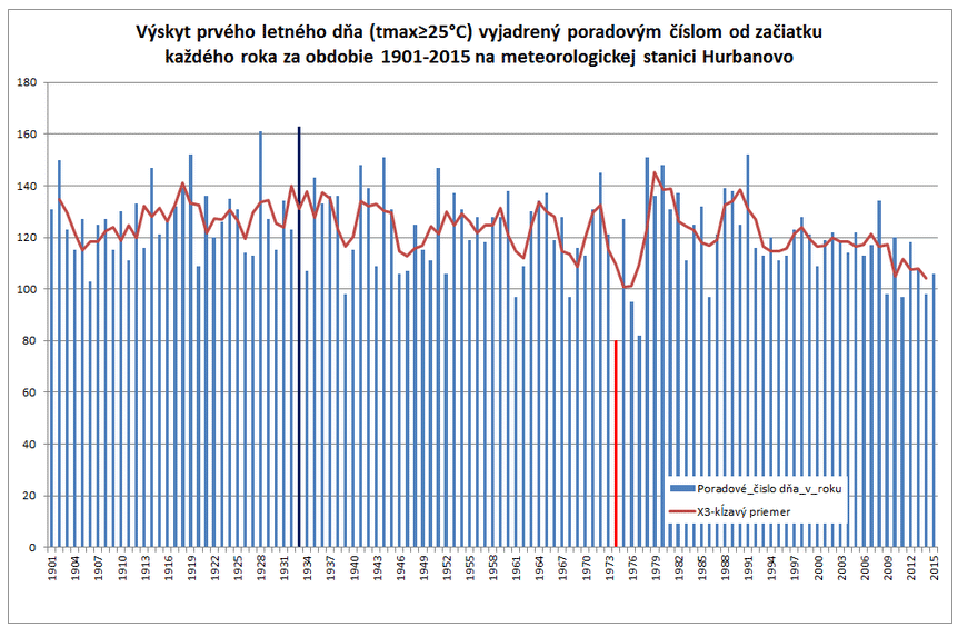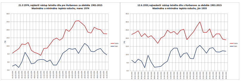 Na mnohých miestach sme zaznamenali aj letný deň (maximálna teplota vzduchu 25°C a viac). Výskyt nástupu letných dní v jednotlivých rokoch sme spracovali pre najdlhšie kontinuálne merajúcu meteorologickú stanicu na Slovensku Hurbanovo za obdobie 1901-2015 (Obr. 6). Po roku 1990 pozorujeme (až na výnimky) čoraz častejšie skorší výskyt prvého letného dňa na tejto (a nielen) meteorologickej stanici . Prvý letný deň sa tak na tejto meteorologickej stanici v roku 2015 zapísal ako 14. najskorší výskyt za ostatných 115 rokov. Najskorší výskyt v Hurbanove však datujeme v roku 1974 (21.3., 25,3°C) a najneskorší prvý výskyt 12.6.1933. Priebeh maximálnej teploty vzduchu v oboch mesiacoch (marec 1974 a jún 1933) dokumentujeme na obrázkoch (Obr. 7 a Obr. 8).