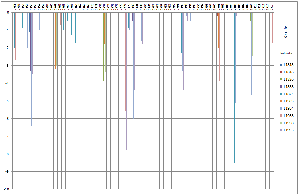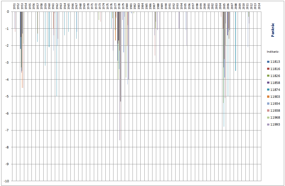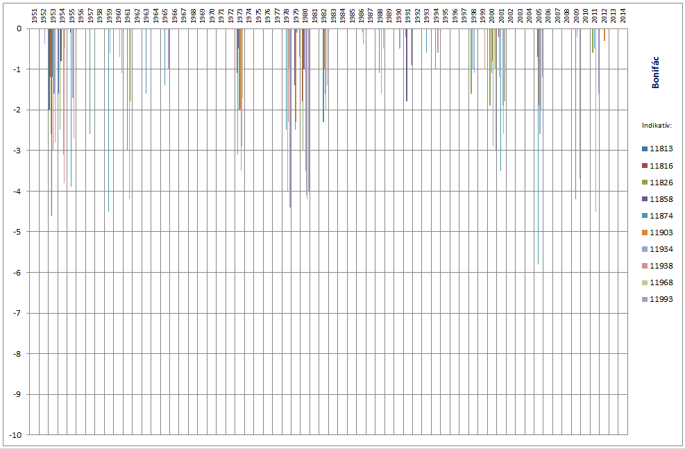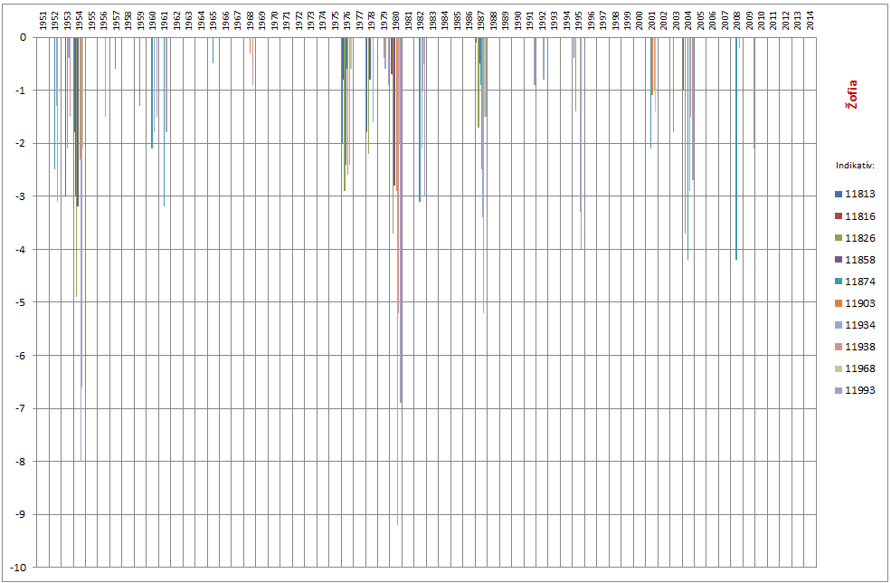 Tab. 1 Absolútne minimum prízemnej minimálnej teploty vzduchu, 1951-2014, 10 staníc (viď. Obr. 1 až Obr. 4, pozri Legenda 1):