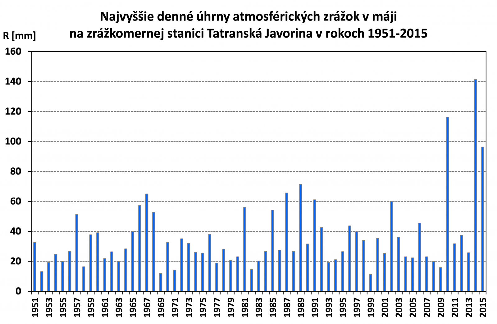 Po necelom týždni sa zopakovala ďalšia zrážkovo zaujímavá situácia. Na severných a severovýchodných svahoch a úpätiach Tatier dosiahli denné úhrny zrážok 26.5.2015 ojedinele najvyššie hodnoty v máji, aspoň od polovice 20. storočia. V tomto prípade mali zrážky trvalý charakter a nesprevádzali ich búrky. Z obsahu priložených grafov si pozornosť zaslúži výskyt veľmi vysokých denných úhrnov zrážok v Tatranskej Javorine v rokoch 2010, 2014 a 2015. Podobné tendencie boli zaregistrované aj v iných regiónoch Slovenska, aj keď možno nie v takej koncentrovanej podobe, ako sa to stalo v Tatranskej Javorine.