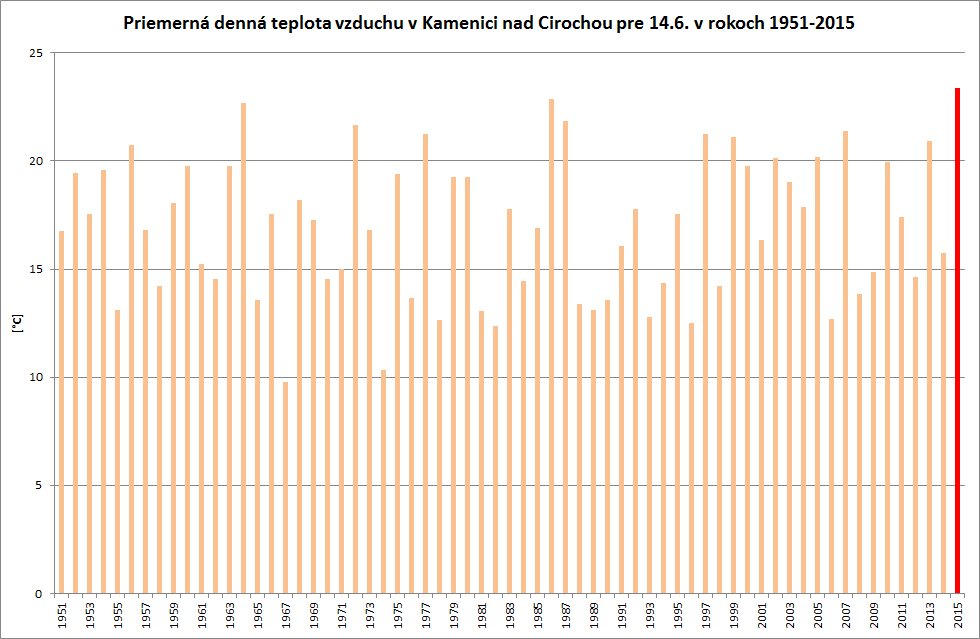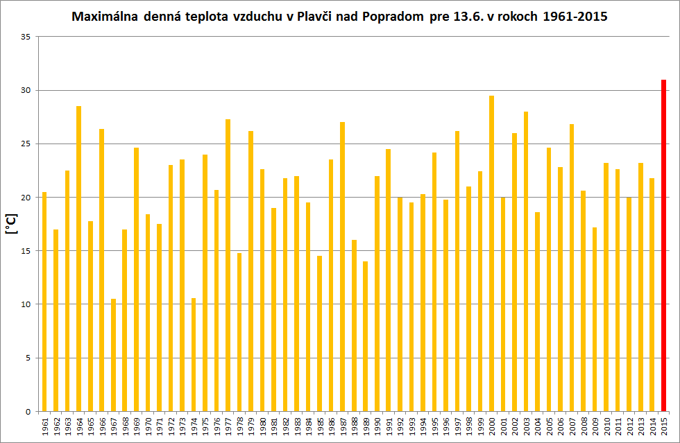 V nedeľu (14.6.2015) dosiahla maximálna denná teplota vzduchu na Slovensku najvyššiu hodnotu v Podhájskej, kde namerali 32,5 °C. Rekordy vybraných charakteristík teploty vzduchu sa tento deň vyskytli na strednom a východnom Slovensku. Výnimkou boli Piešťany, kde bola v nedeľu rekordne vysoká priemerná denná teplota vzduchu, ktorá tam dosiahla 24,6 °C. Rekordy teploty vzduchu, ktoré boli dosiahnuté na niektorých meteorologických staniciach počas víkendu prekonávali doterajšie rekordy prevažne z rokov 2000 a 2003. Ale v niektorých prípadoch padli viac ako 50 ročné rekordy. Napríklad v Bardejove a v Trebišove, kde teplota vzduchu v sobotu dosiahla 31,3 °C, resp. 32,6 °C, bol prekonaný rekord maximálnej dennej teploty vzduchu pre 13. jún z roku 1964.