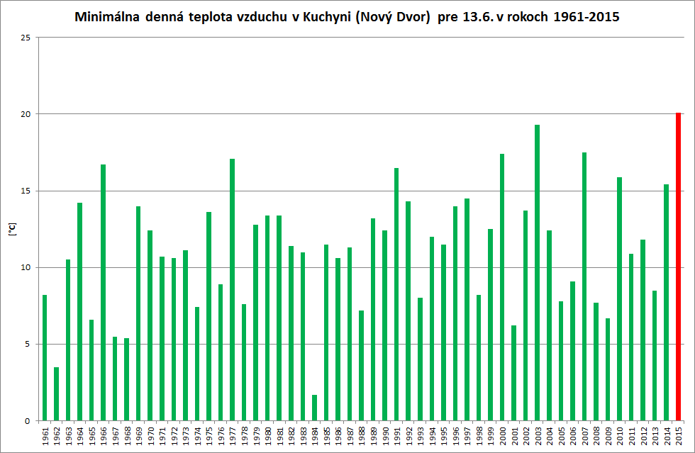V sobotu (13.6.2015) dosiahla maximálna denná teplota vzduchu na Slovensku najvyššiu hodnotu v Holíči a v Trebišove, kde namerali 32,6 °C. V sobotu sa rekordy maximálnej a priemernej dennej teploty vzduchu sústreďovali výlučne do niektorých oblastí severného a východného Slovenska. V prípade minimálnej dennej teploty vzduchu však boli naopak rekordy zaregistrované tento deň na západnom Slovensku. Stalo sa to v Kuchyni na letisku, v Piešťanoch a v Podhájskej, pričom na všetkých týchto troch meteorologických staniciach bola noc z piatku (12.6.2015) na sobotu (13.6.2015) tropická, čiže teplota vzduchu tam neklesla pod 20 °C.