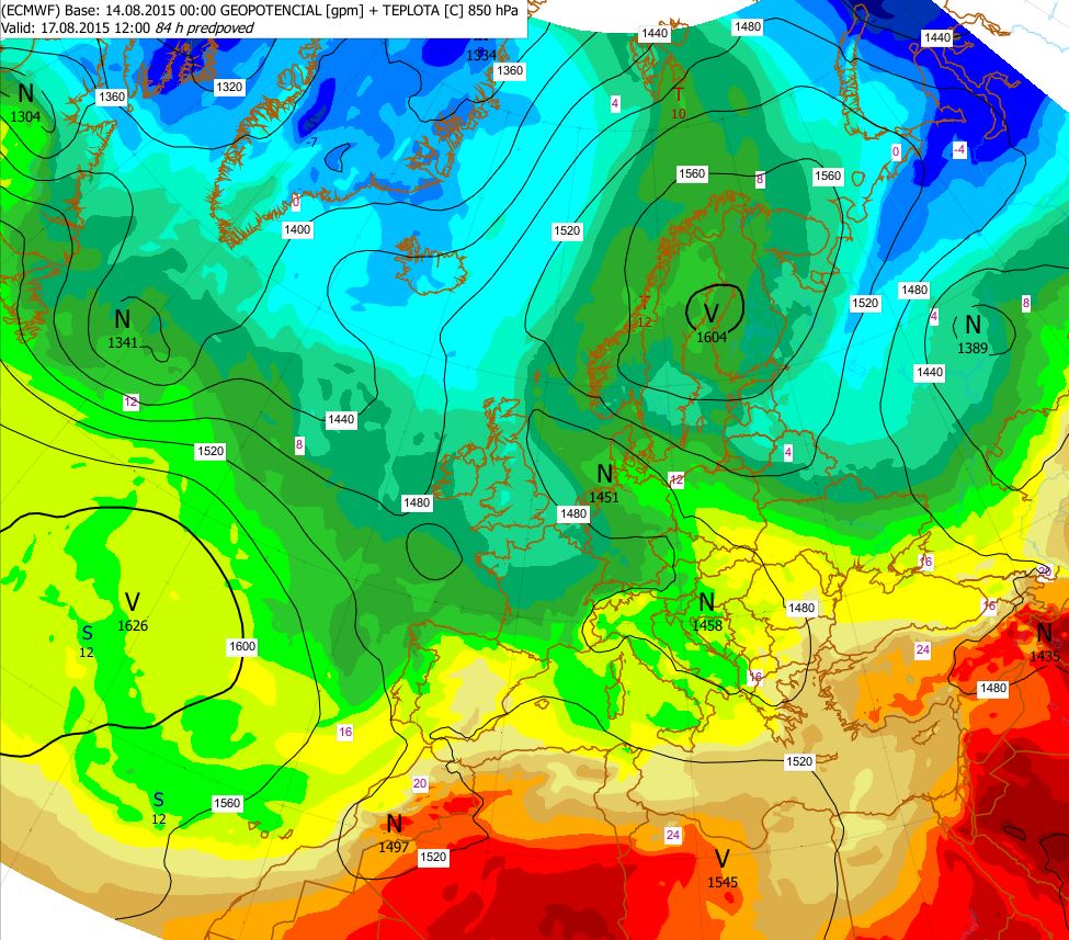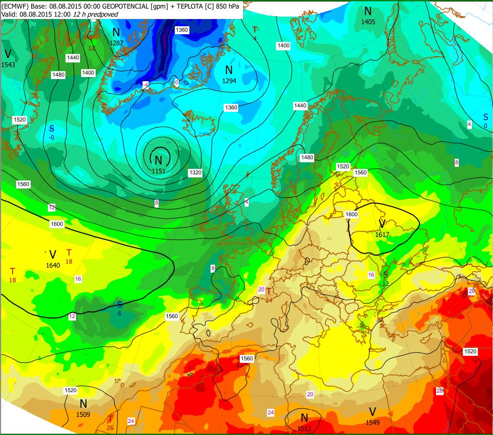 Obr. 1 Teplota vzduchu v hladine 850 hPa (približne 1,5 km nad zemským povrchom) dňa 8.8.2015 (zdroj: model ECMWF)