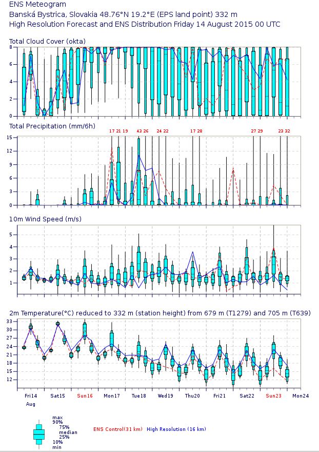Obr. 2 Pravdepodobnostná predpoveď modelu ECMWF z dňa 14.8.2015 na nasledujúcich 10 dní pre Banskej Bystrici