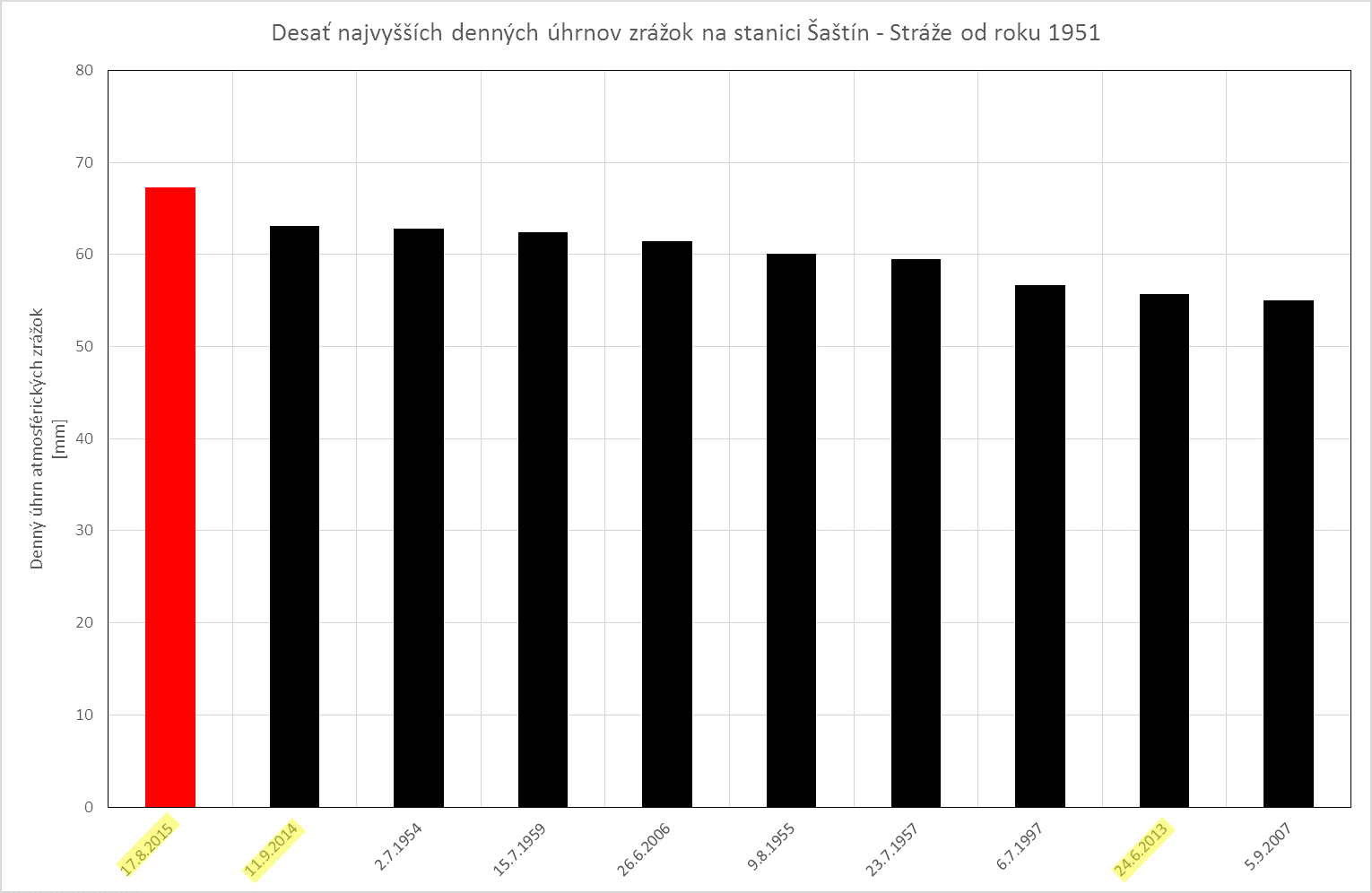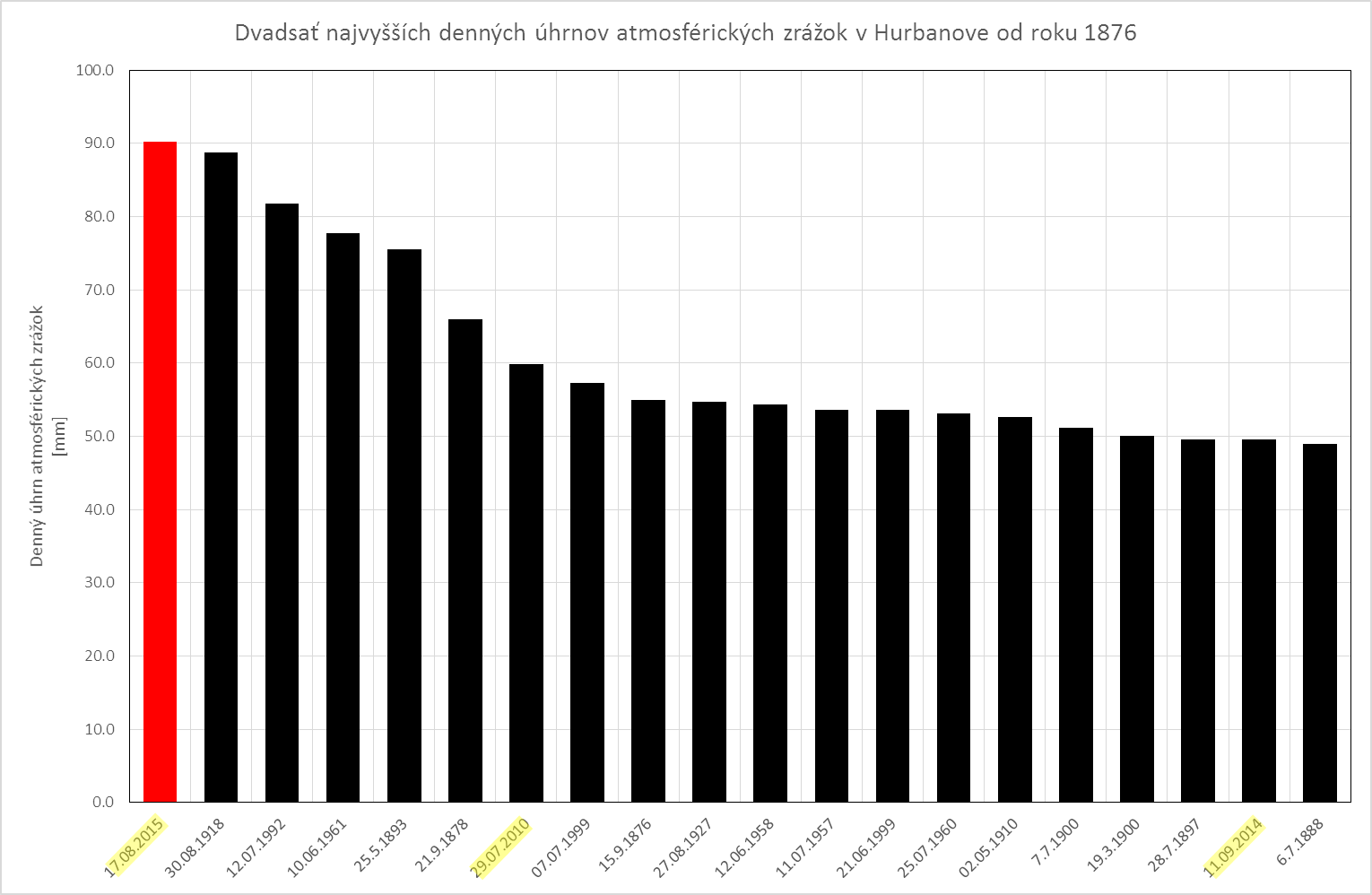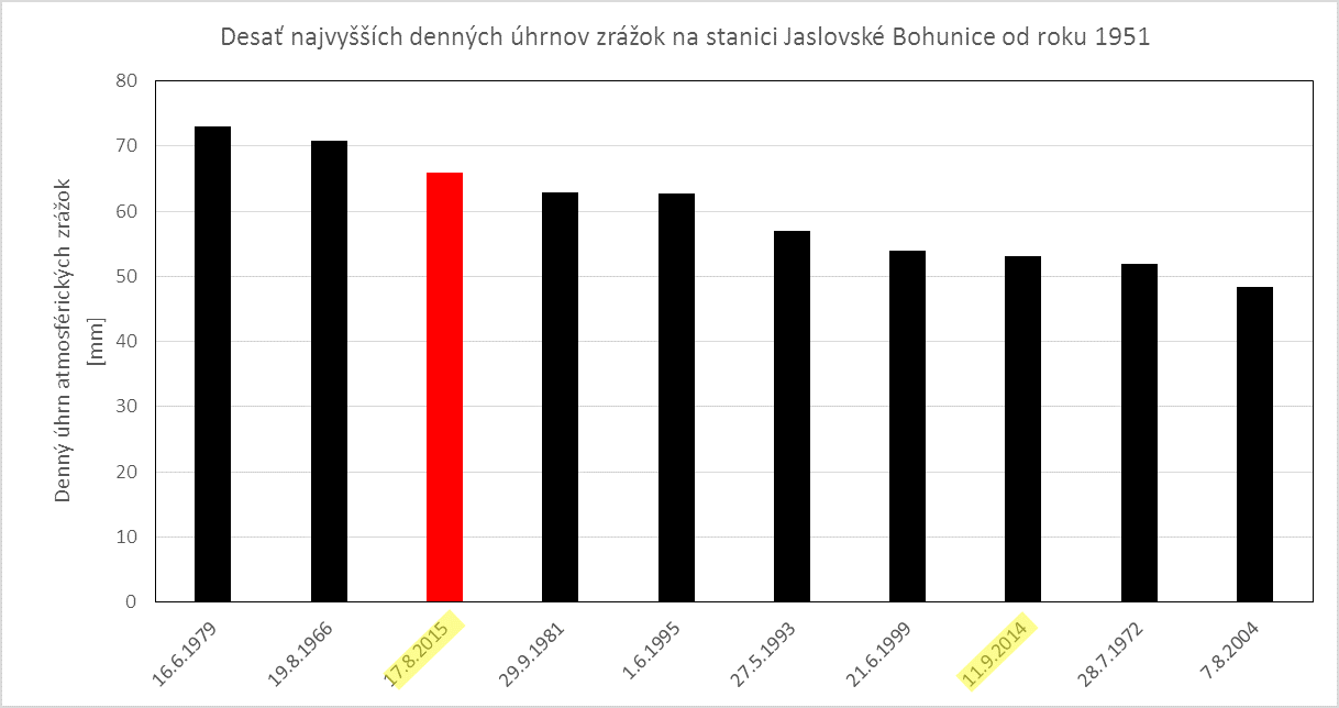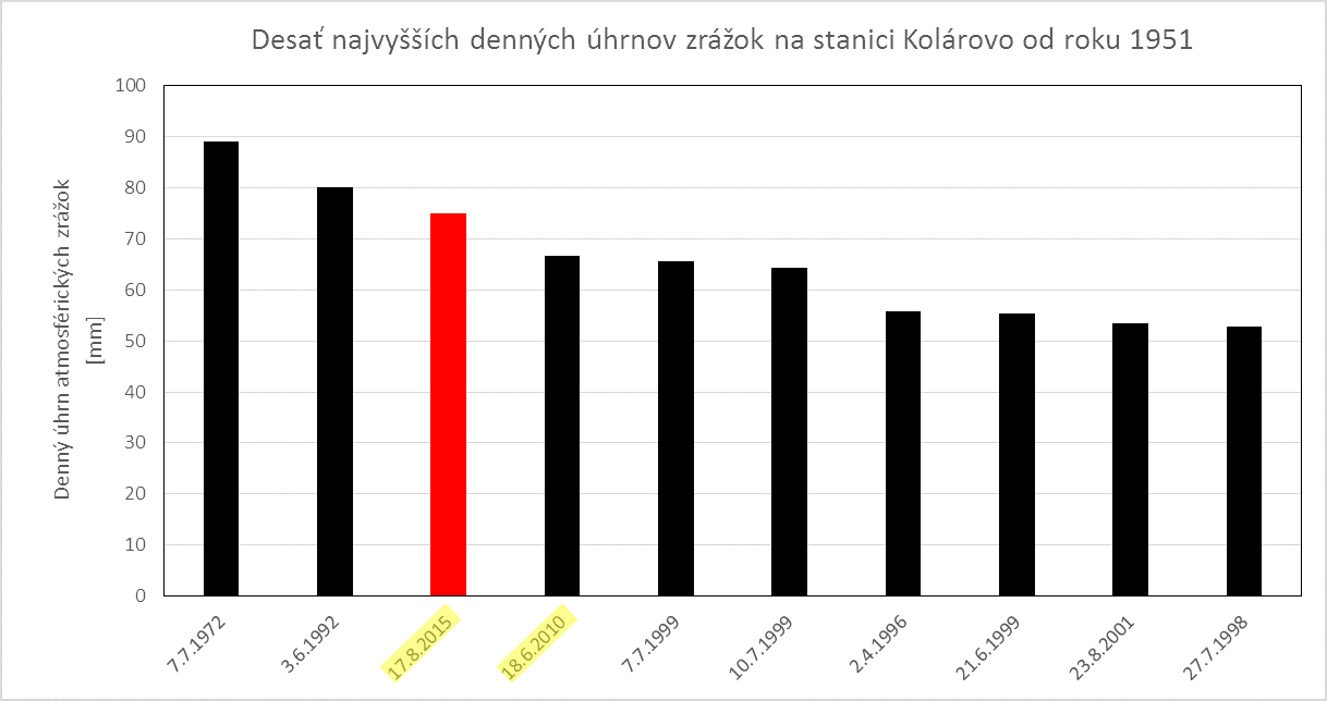 Včera (17.8.2015), v priebehu popoludnia, večera a v noci, napršalo v Hurbanove 90,2 mm zrážok. Je to najvyšší denný úhrn na tomto meteorologickom observatóriu minimálne od roku 1876. Pásmo zrážok, v ktorom sa tento úhrn vyskytol, sa vytvorilo v priestore severovýchodne od Budapešti a postupovalo cez Podunajskú nížinu, severnú časť Malých Karpát, Myjavskú pahorkatinu, severné Záhorie na Moravu a ďalej do Čiech a Nemecka. Určitou zvláštnosťou bolo, že tento pás výdatných zrážok nebol veľmi široký. Vyššie ako 60 mm denné úhrny zrážok sme namerali aj v Kolárove (75 mm), v Jaslovských Bohuniciach (66 mm) a v Šaštíne (67 mm). V Šaštíne to bol najvyšší denný úhrn zrážok aspoň od polovice 20. storočia. V Kolárove od roku 1951 napršalo viac ako počas spomínaného 17.8.2015 iba počas 2 dní. Konkrétne 7.7.1972 tam denný úhrn zrážok dosiahol 89 mm a 3.6.1992 to bolo 80 mm. Podobne v Jaslovských Bohuniciach napršalo viac ako včera iba 19.8.1966 (71 mm) a 16.6.1979 (73 mm).