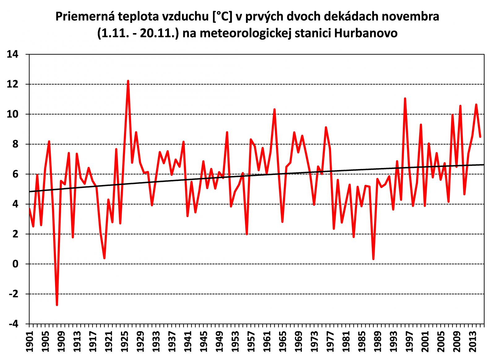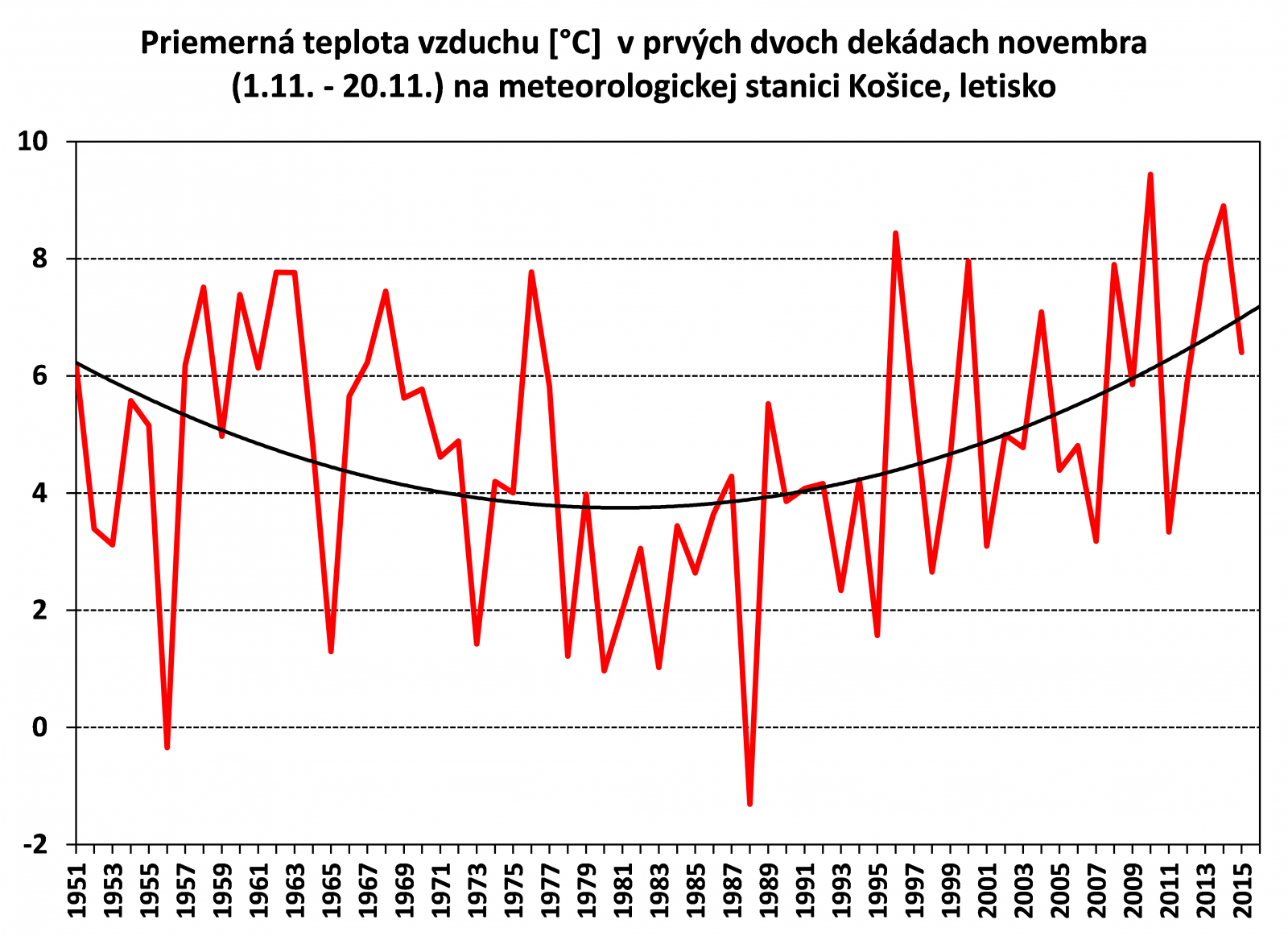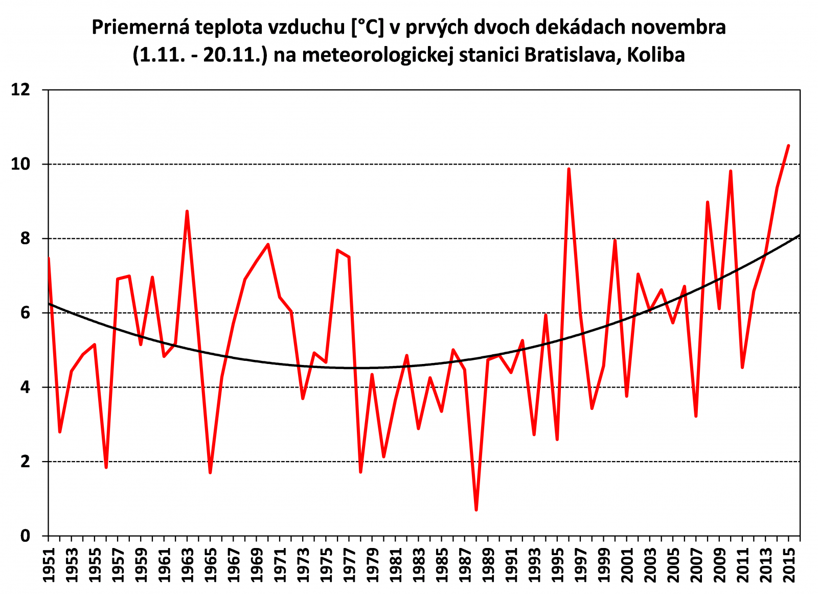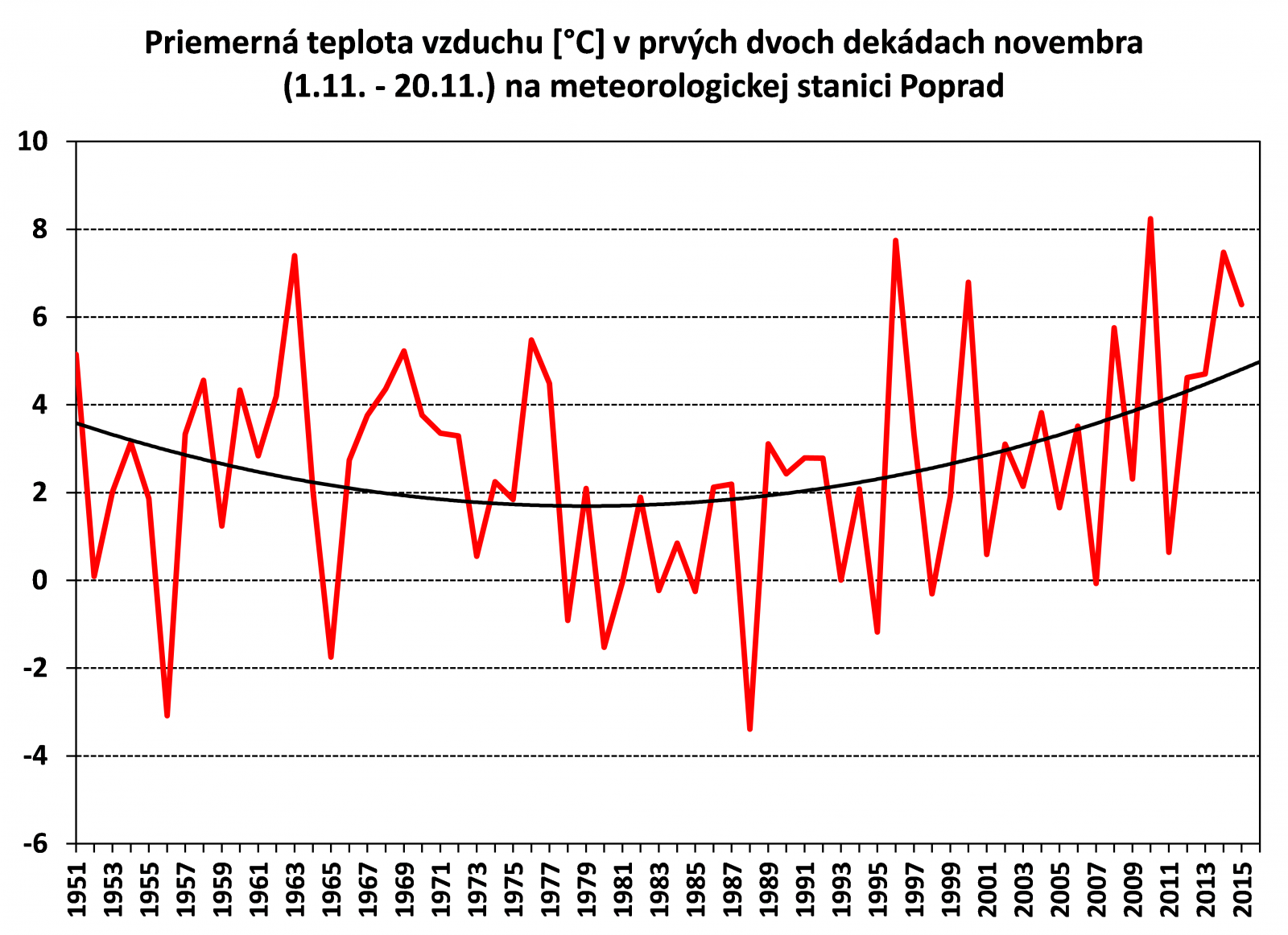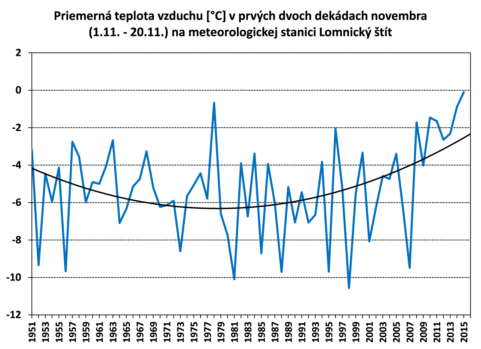 Priemerná teplota vzduchu prvých 2 novembrových dekád v roku 2015 bola rekordne vysoká v Bratislave na Kolibe, aj na Lomnickom štíte. Na meteorologických staniciach v nížinách alebo v údoliach a v kotlinách Slovenska bolo obdobie od 1. do 20. novembra 2015 tiež teplotne nadnormálne. Na začiatku tohtoročného novembra bolo niekoľko dní, kedy bola teplotná inverzia a práve táto skutočnosť posunula niektoré vrcholové a svahové polohy Slovenska do rekordnej teplotnej úrovne prvých 2 novembrových dekád.