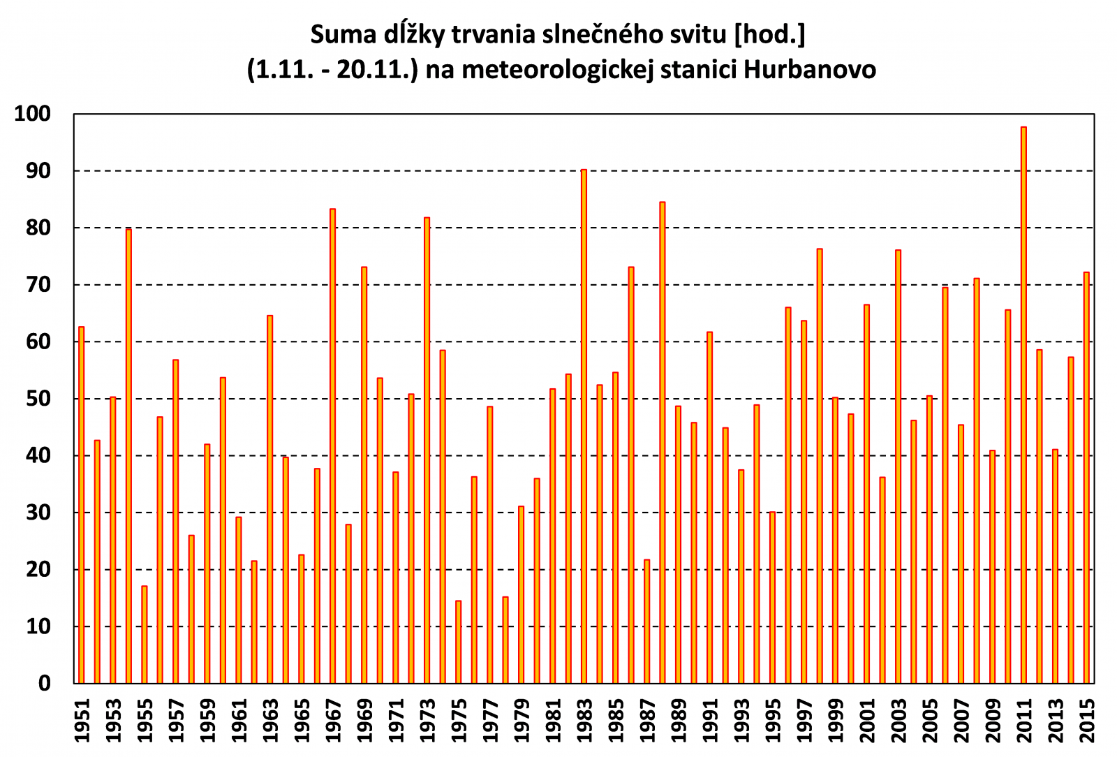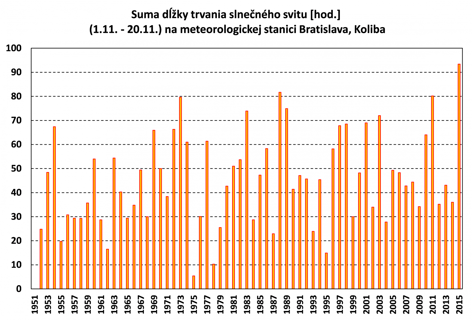 Na juhozápadnom Slovensku si teplé počasie mohli ľudia užívať aj pri častejšom slnečnom svite. Jeho trvanie bolo rekordne dlhé pre prvé 2 novembrové dekády, napríklad v Bratislave na Kolibe.