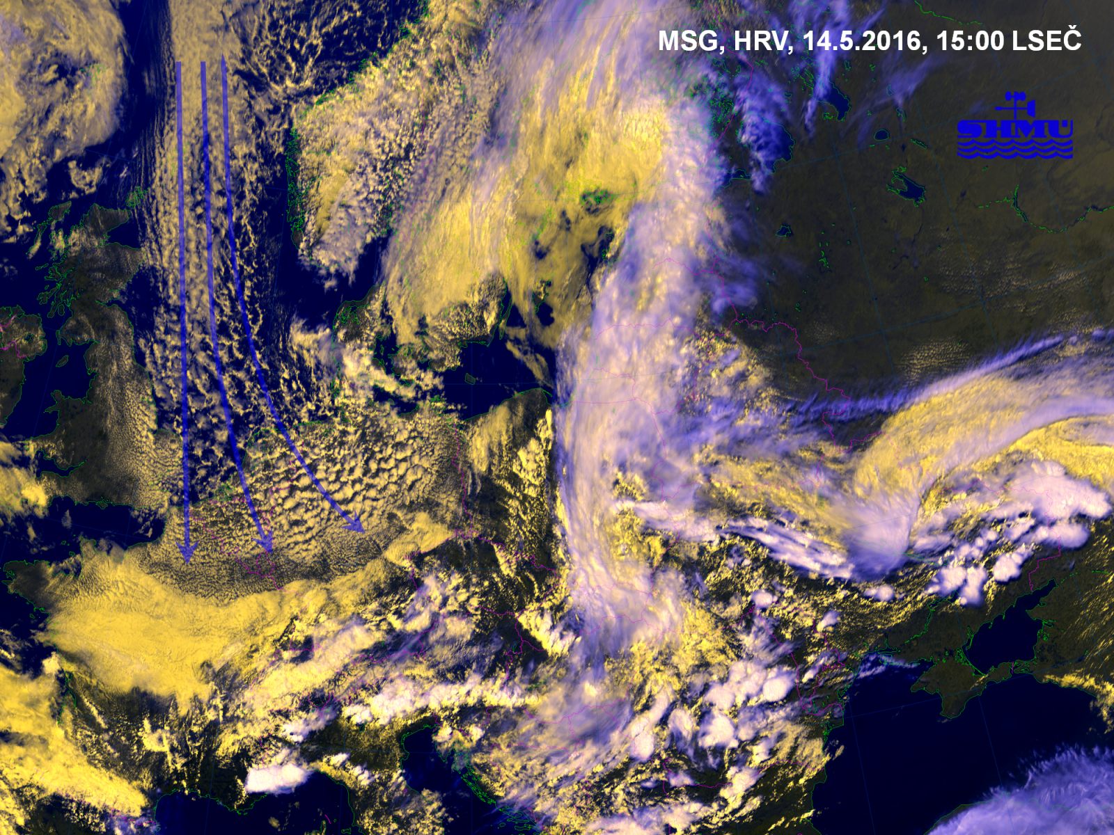 V studenom a vlhkom vzduchu, ktorý za ním prúdi, sa vytvára typická plytká kopovitá oblačnosť, dobre viditeľná na obr. vpravo hore (tiež vidieť, že aj pred, aj za oklúznym frontom vznikajú prehánky a búrky, napr. aj na juhozápade Slovenska). Cez Slovensko prejde studený front v noci na nedeľu 15.5 a za ním k nám začne prenikať tento studený vzduch (animácia pri obr. 1b).