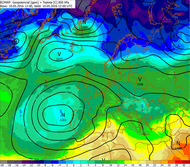 Obr. 1b - Teplota a geopotenciál hladiny 850 hPa (výška cca 1500 m), model ECMWF, 14.5.2016, 12:00 UTC. Studený vzduch sa dostáva od severu ponad Severné more do vnútrozemia Európy (animácia).