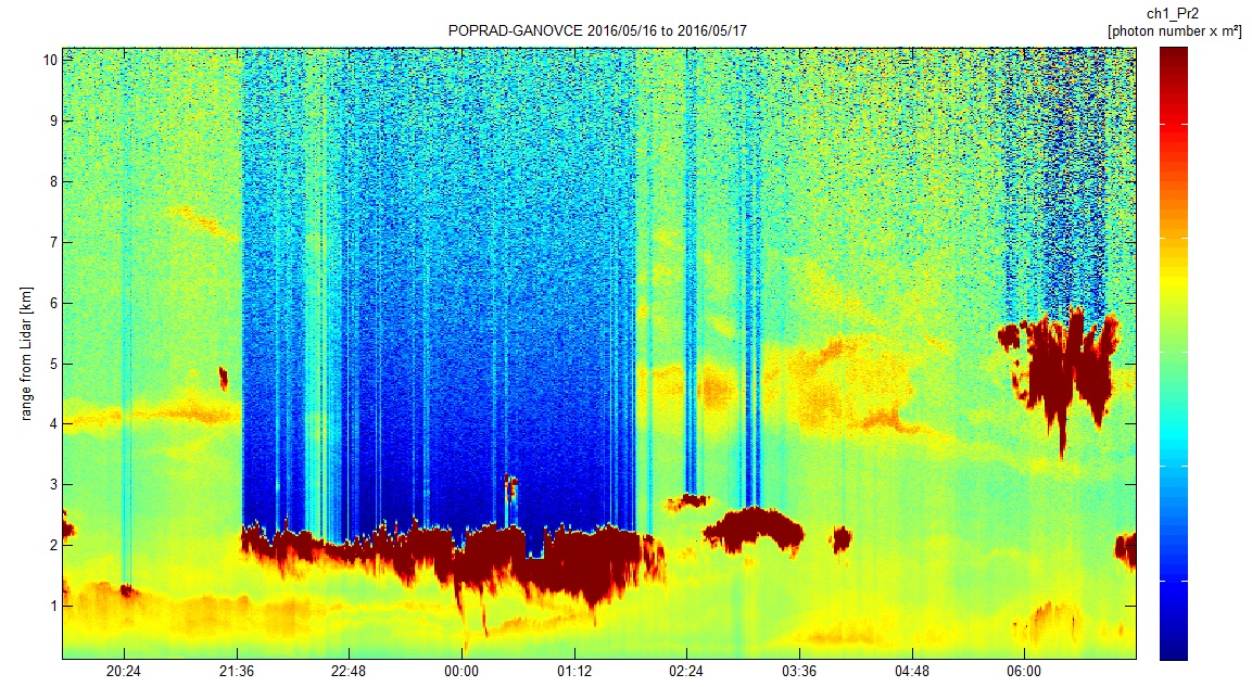 Obr. 1. Vertikálny profil aerosólov vo vybranom čase 16. – 17. mája 2016, os x reprezentuje čas [UTC] a os y vzdialenosť od zemského povrchu [km]