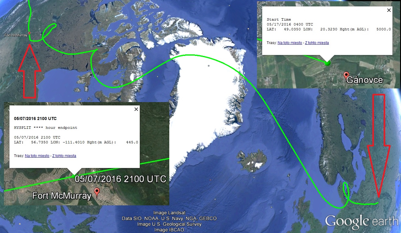 Podstatný dôkaz o tom, že ide o dym z kanadského požiaru nám poskytol model HYPSPLIT, ktorý prevádzkuje Air Resources Laboratory, NOAA. Tento model nám dokáže doslova povedať to, odkiaľ k nám prišiel vzduch. Na 2. obrázku môžeme vidieť, že vzduch s dymom pozorovaný 17. mája vo výške 5 km nad terénom o 04:00 UTC bol dňa 7.5. o 21:00 UTC vo výške iba 445 m nad terénom v oblasti kanadského mesta Fort McMurray. Nad Slovensko sa teda v tomto prípade dostal za približne 9 dní. Trajektória po ktorej „putoval“ je na obrázku znázornená zelenou farbou.