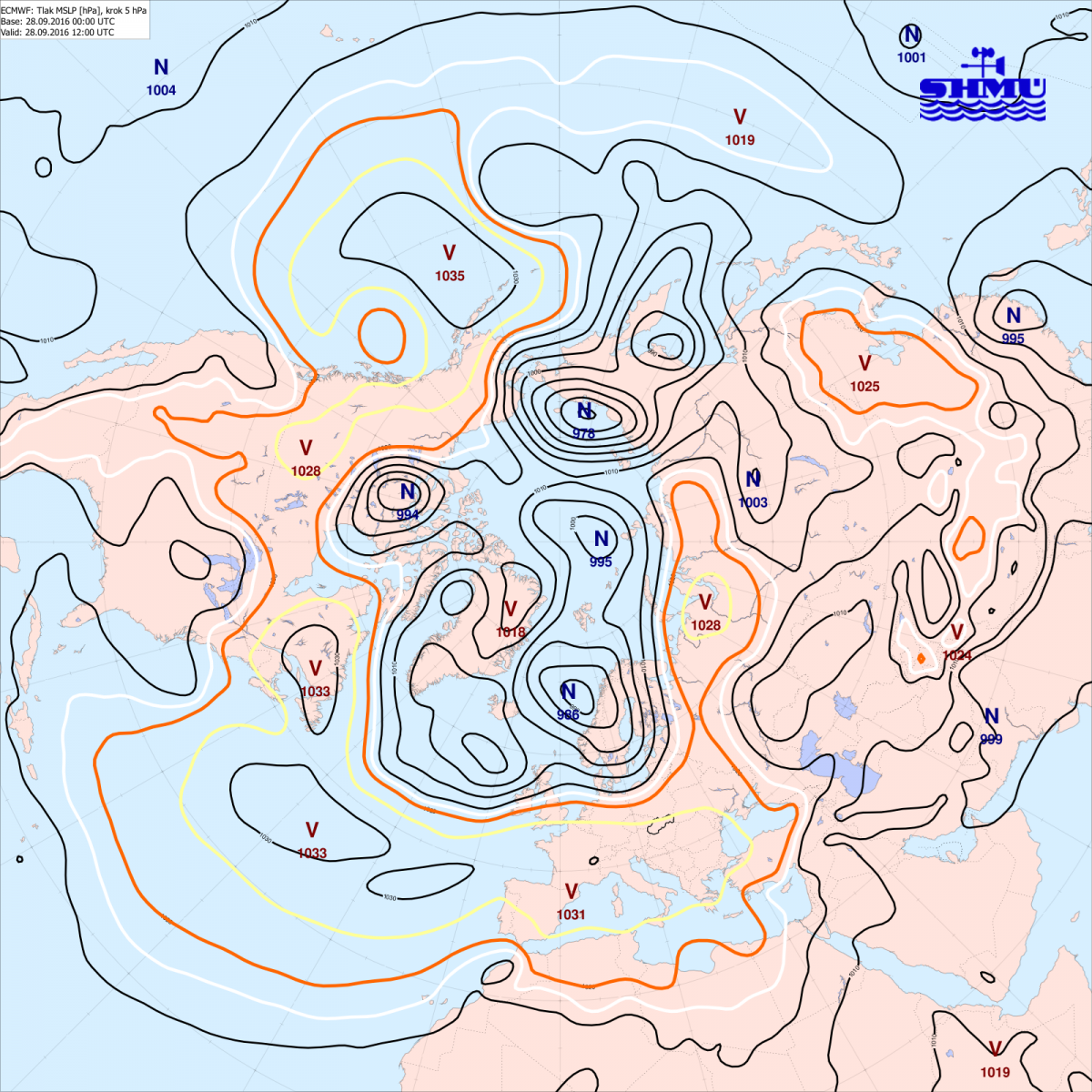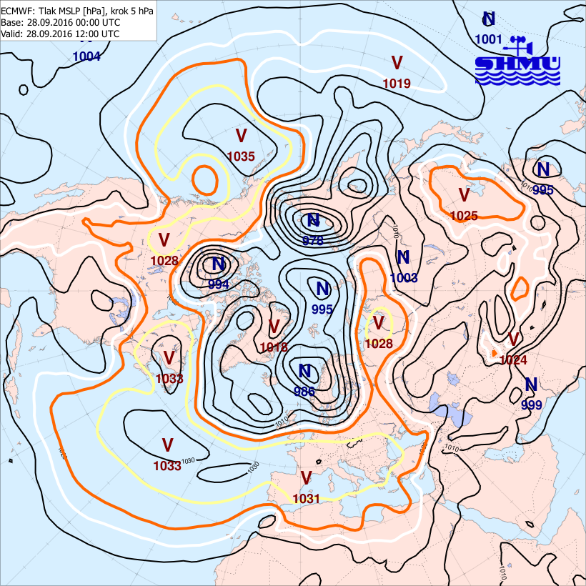 Tlak vzduchu prepočítaný na hladinu mora z modelu ECMWF 28.9.2016 12:00 UTC. Rozsiahla oblasť vysokého tlaku vzduchu nad severnou hemisférou približne okolo 30-50° rovnobežky. Bielou je izobara 1017,5 hPa, oranžovou 1020 hPa a žltou 1025 hPa.
