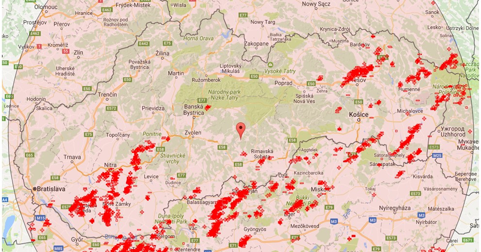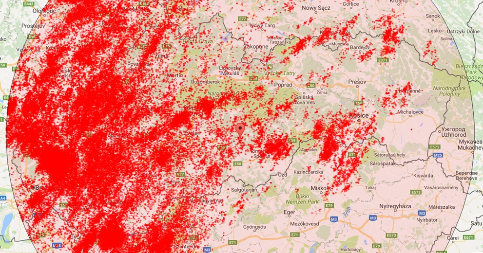 Obr. 1 Detekcie výbojov bleskov na území Slovenska dňa 13.5.2016 (vľavo) a 31.7.2016 (vpravo)