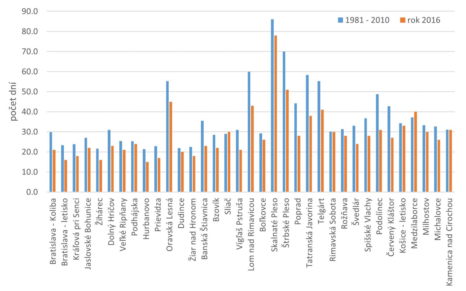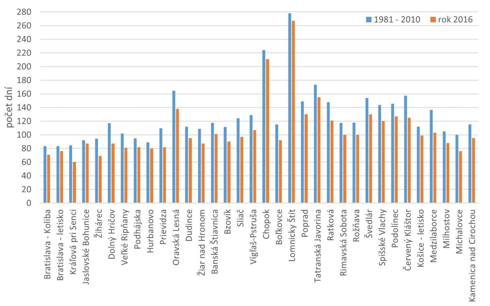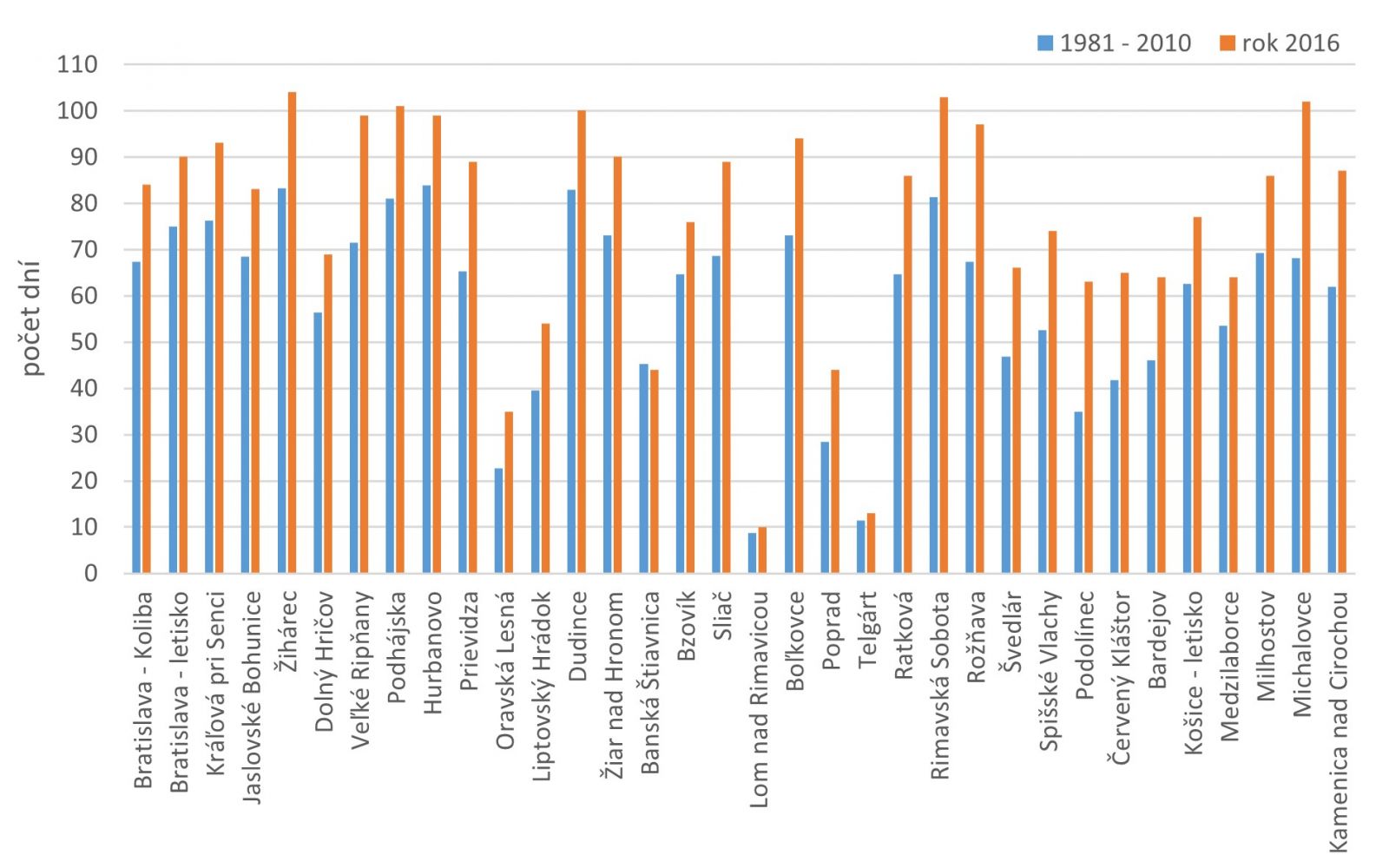 Obr. 1 Počet letných dní (Tmax ≥ 25 °C) na vybraných staniciach Slovenska v roku 2016 a v normálovom období 1981 – 2010