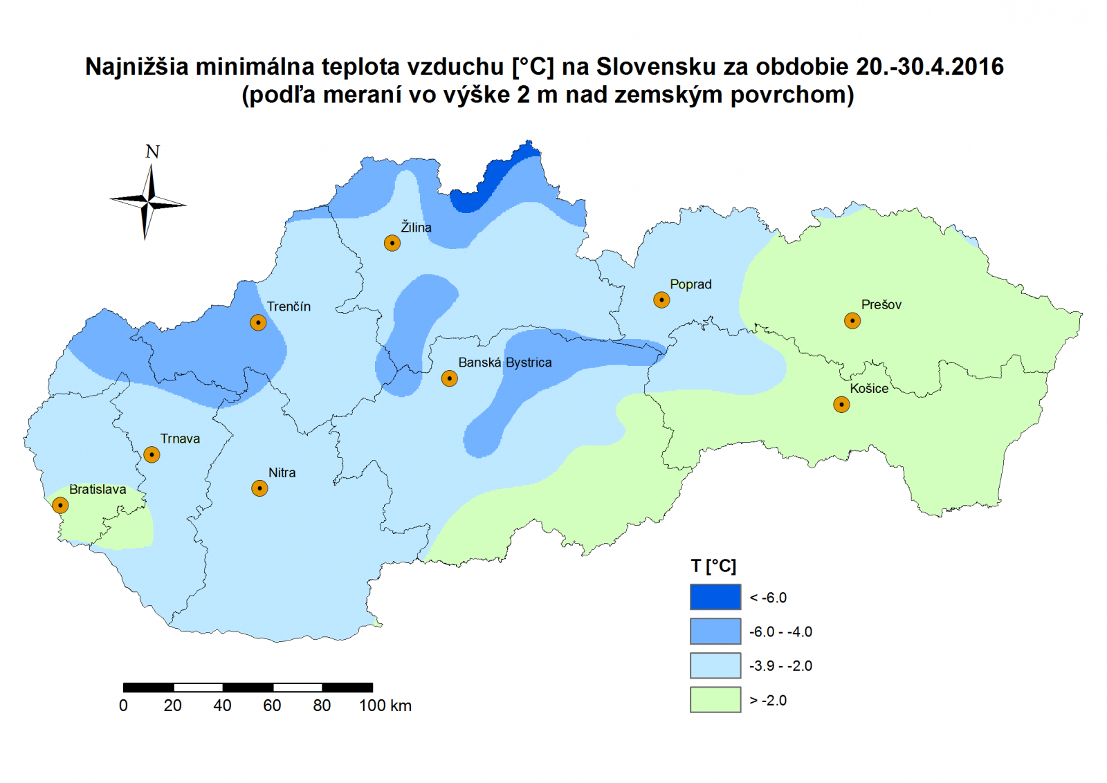 Obr. 3 Mapa najnižšej minimálnej teploty vzduchu za obdobie 20. – 30.04.2016