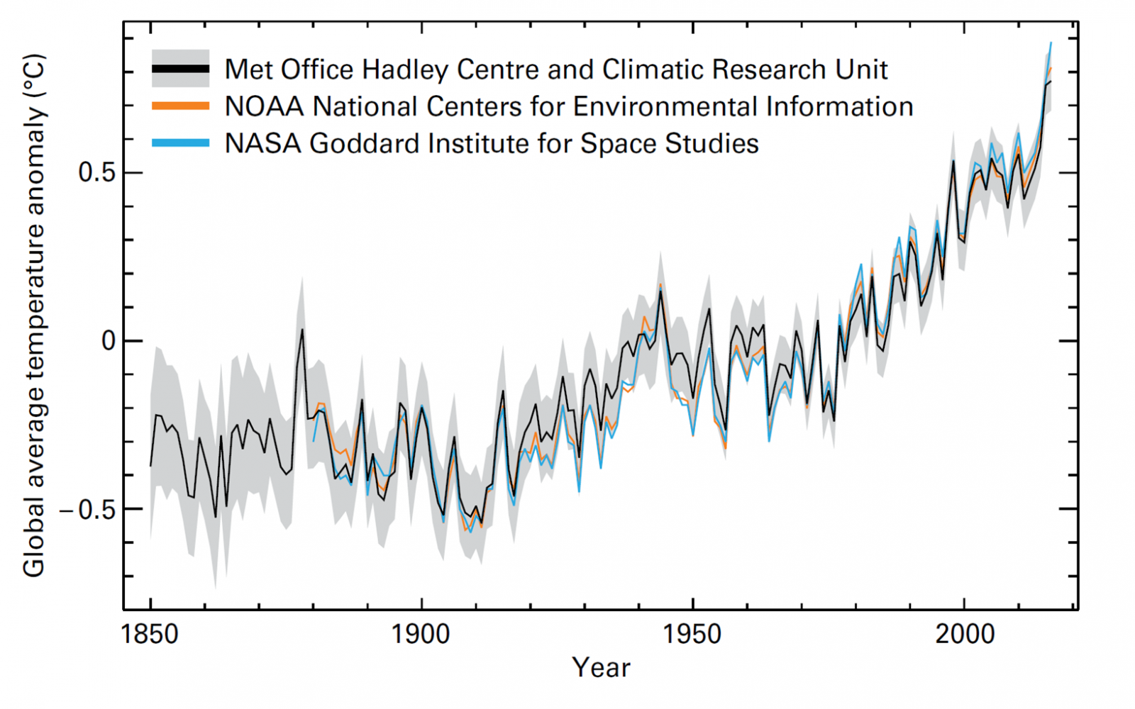 Obr. 1: (vľavo) Vývoj odchýlky globálnej teploty vzduchu [°C] podľa troch svetových klimatologických centier v období 1850 až 2016 (odchýlky v porovnaní s normálom 1961-1990); (vpravo) priestorové rozloženie odchýlok teploty vzduchu (v porovnaní s 1961-1990) nad pevninami a oceánmi v roku 2016 [Zdroj: WMO] - obrázky v lepšom rozlíšení [Obr. 1a - Obr. 1b]