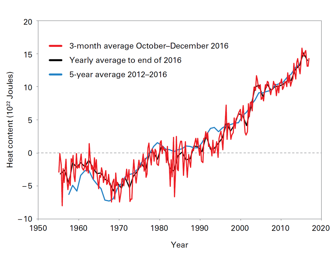 Rekordne teplé, a to hlavne v prvej polovici roku 2016, boli aj svetové oceány, ktoré v globále dosiahli aj druhý najvyšší tepelný obsah (množstvo tepla obsiahnuté v jednotkovom objeme morskej vody), hneď po roku 2015 (v hodnotenom období 1955-2016). Jednou z príčin rekordne vysokej teploty povrchu oceánov, najmä v tropických šírkach, bol spolu s pokračujúcim globálnym otepľovaním aj veľmi silný klimatický fenomén El Niño 2015/2016, ktorý sa spolu s epizódami v rokoch 1997/98 a 1982/83 zaradil medzi tri najsilnejšie epizódy El Niño za posledných aspoň sto rokov. V dôsledku silného El Niña, ktorý svojimi dopadmi vrcholil vo februári 2016, sme v období medzi novembrom 2015 a februárom 2016 pozorovali na globálnej úrovni aj veľmi rýchly rast hladiny oceánov, a to až o 15 mm (priemerný ročný rast od roku 1993 je pritom 3,0-3,5 mm).
