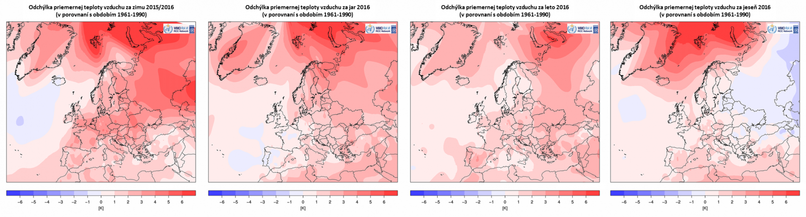 Celkom určite medzi najdôležitejšie závery WMO správy patrí skutočnosť, že rok 2016 bol historicky najteplejší rok aspoň od roku 1850, tak nad pevninami ako aj oceánmi. V porovnaní s klimatickým normálom 1961-1990 bol rok 2016 teplejší o 0,83 °C ± 0,1 °C (Obr. 1 vľavo). V porovnaní s novším normálom 1981-2010 bol rok 2016 teplejší o 0,52 °C. Ak by sme za referenčné obdobie považovali predindustriálne obdobie (koniec 19. storočia), odchýlka globálnej teploty vzduchu by dosiahla až +1,1 °C. O veľmi rýchlom tempe otepľovania v posledných rokoch vypovedá aj fakt, že rok 2016 bol o 0,06 °C teplejší ako predošlý, doposiaľ rekordne teplý rok 2015. Ako vidieť aj na Obr. 1 (vpravo), minulý rok bol relatívne teplejší nad prevažnou časťou pevnín, s výnimkou niektorých regiónov v Južnej Amerike (severná Argentína) a juhozápadnej Austrálie. Významne teplejšia bola pritom celá severná pologuľa, kde odchýlky teploty v porovnaní s normálom 1961-1990 dosiahli regionálne aj viac ako +3,0 °C (Aljaška, severná Kanada, Grónsko, Špicbergy, severné Rusko a Čukotský polostrov). Z pohľadu ročných sezón bolo relatívne najteplejšie v zime 2015/2016, a to najmä na severnej pologuli (Obr. 2). Len na okraj možno pripomenúť, že napríklad v Európe skončil rok 2016 ako tretí najteplejší aspoň od roku 1850 (odchýlky teploty vzduchu v jednolivých sezónach sú zobrazené na Obr. 3, odchýlky za rok možno vidieť tu).