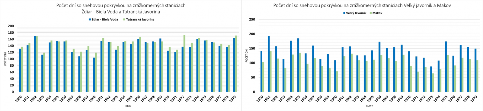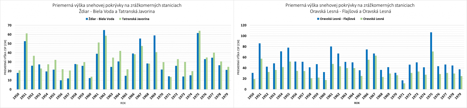 Dlhodobé priemerné hodnoty analyzovaných charakteristík snehovej pokrývky v období 1950/1951 – 1979/1980 pre Ždiar – Bielu Vodu (priemerný počet dní so snehovou pokrývkou 142 a priemerná výška snehovej pokrývky 29 cm; Obr. 2 a 3), Oravskú Lesnú – Flajšovú (priemerný počet dní so snehovou pokrývkou 145 a priemerná výška snehovej pokrývky 52 cm) a Veľký Javorník (priemerný počet dní so snehovou pokrývkou 143 a priemerná výška snehovej pokrývky 47 cm), vypočítané z pôvodných a doplnených sezónnych hodnôt, pomerne dobre korešpondujú s hodnotami na ich referenčných staniciach a súčasne dobre dopĺňajú pole hodnôt týchto charakteristík snehovej pokrývky vzhľadom na ich nadmorskú výšku a polohu voči prevládajúcemu prúdeniu vzduchu, prinášajúcemu vlhké vzduchové hmoty do tohto regiónu v priebehu zimnej sezóny. Určitým nedostatkom tohto prístupu je, že v sezónach bohatých, resp. chudobných na snehovú pokrývku, mohla byť chyba vzniknutá dopĺňaním o niečo väčšia, ako v sezónach so štandardnými podmienkami.