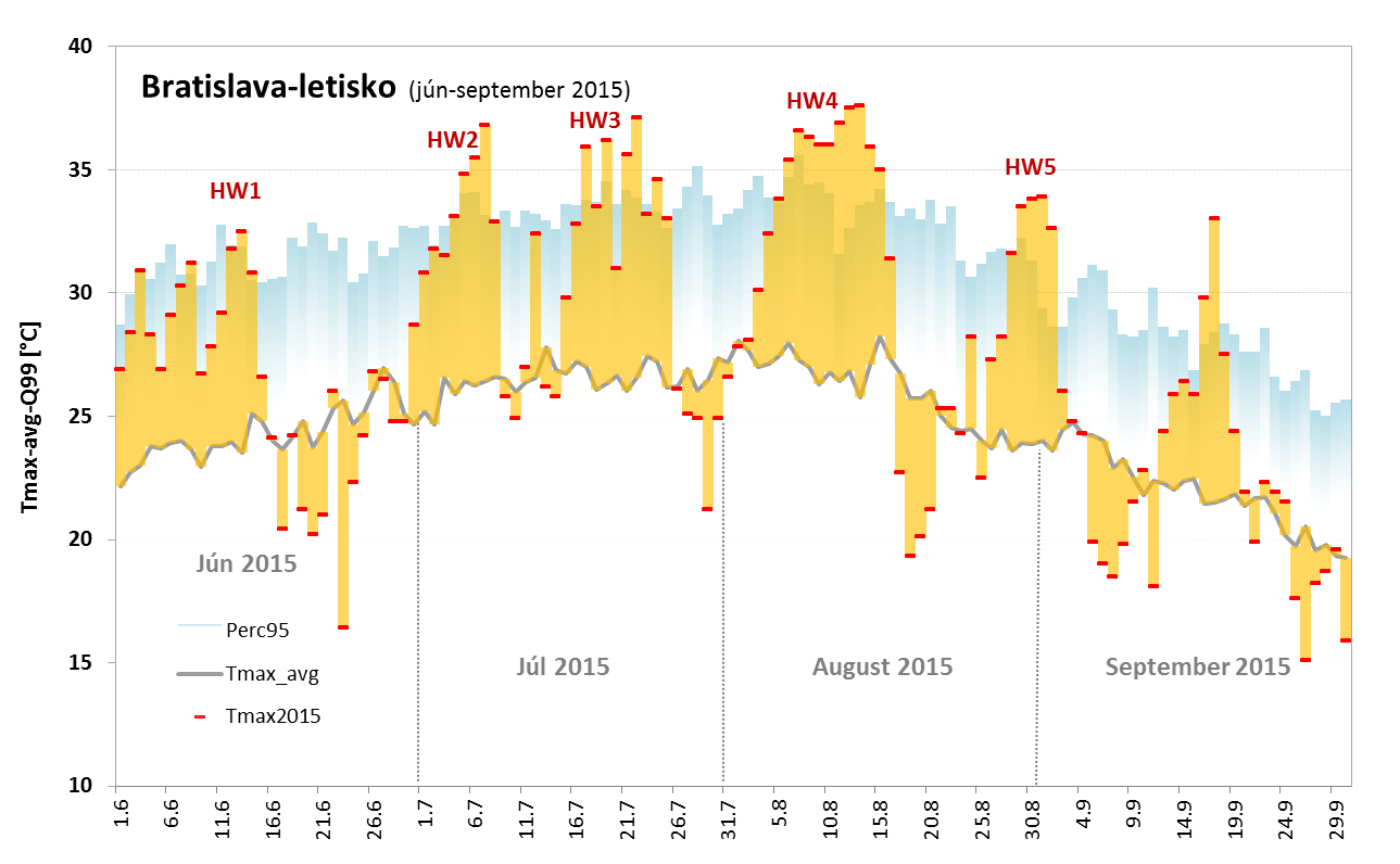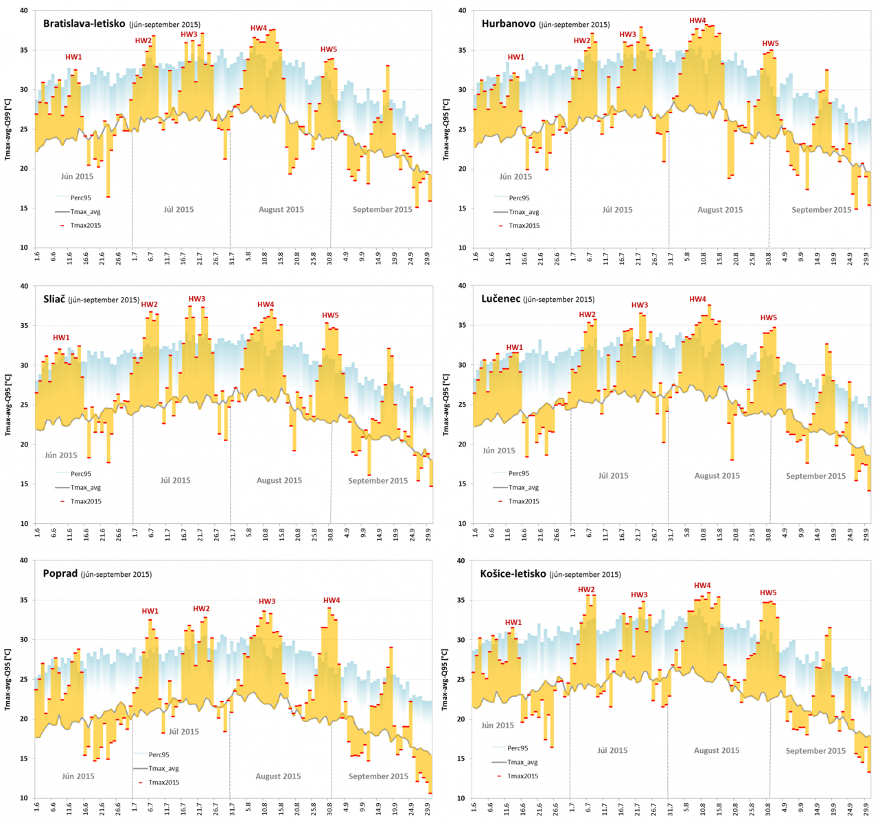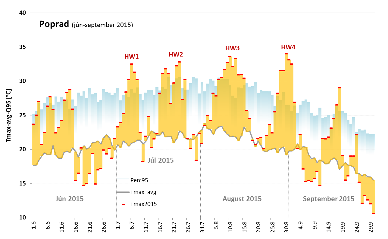Podľa štúdie Výberči et al 2017 boli periódy letných horúčav v roku 2015 identifikované v rámci obdobia 1996-2015 tak z meteorologického ako aj bioklimatologického hľadiska (takmer 540 predčasných úmrtí) ako najzávažnejšie (najextrémnejšie). Uvedená hodnota úmrtnosti predstavuje 14 %-ný nárast celkovej úmrtnosti oproti očakávaným hodnotám. Svojimi dôsledkami bola obzvlášť pozoruhodná najmä mimoriadna perióda horúčav v prvej polovici augusta 2015 (Obr. 1). Len táto samotná dlhotrvajúca (až 14 dní; na Obr. 1 označená ako HW4, v prípade Popradu ako HW3) a perzistentná perióda vysokých denných a nočných teplôt (jedna z najzávažnejších v histórii meteorologických pozorovaní na Slovensku, prejavila sa aj v poli odchýlok mesačnej priemernej teploty vzduchu od normálu 1981-2010; Obr. 2), spôsobila vyše 240 predčasných úmrtí, čím sa stala najzávažnejšou individuálnou horúcou epizódou u nás minimálne od roku 1996. Navyše vzhľadom k pozorovanému režimu úmrtnosti v priebehu a po skončení tejto periódy možno predpokladať, že sa v jej priebehu vo zvýšenej miere mohli vyskytovať aj úmrtia odolných (zdravých) ľudí a tých, ktorých smrť sa v blízkej budúcnosti ešte neočakávala.