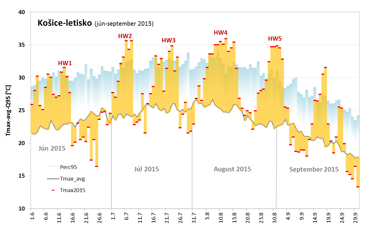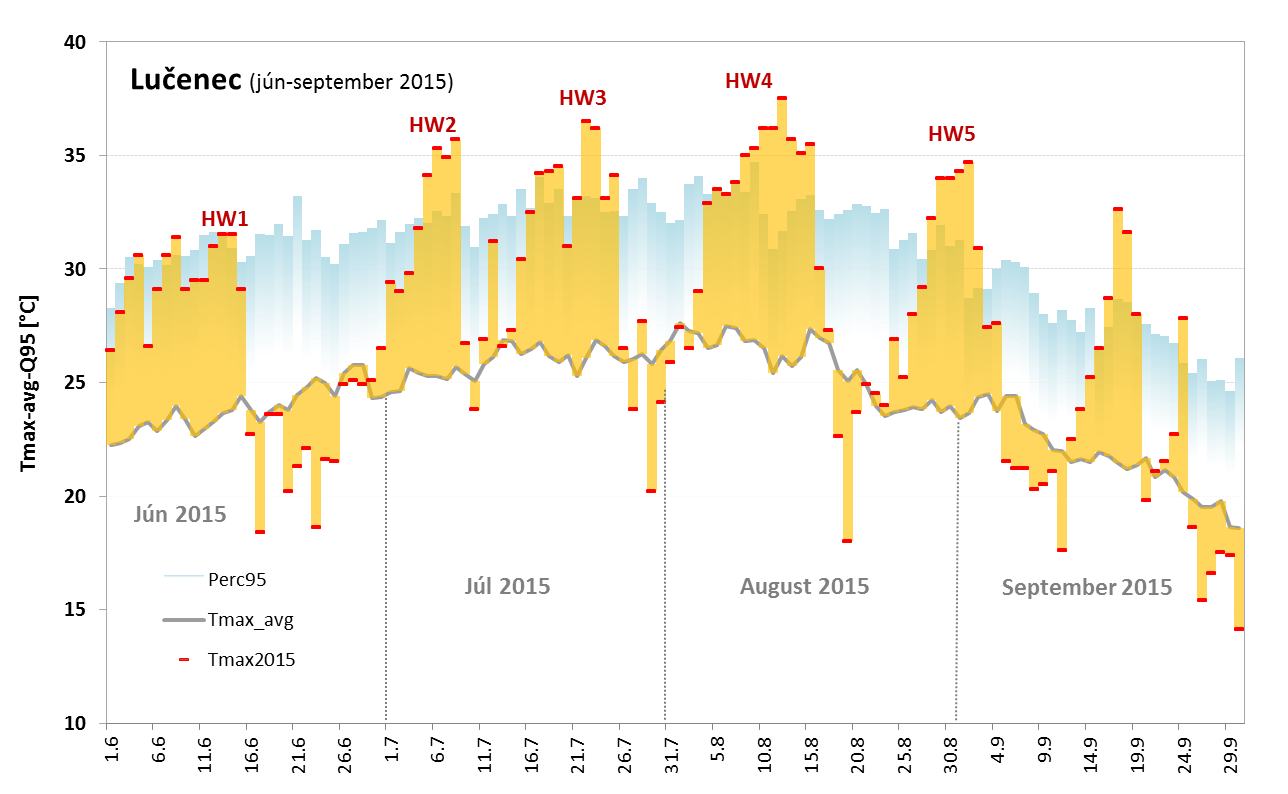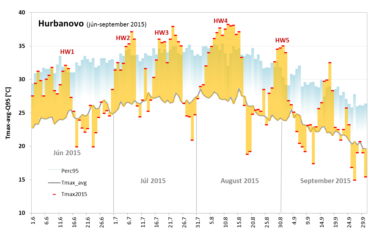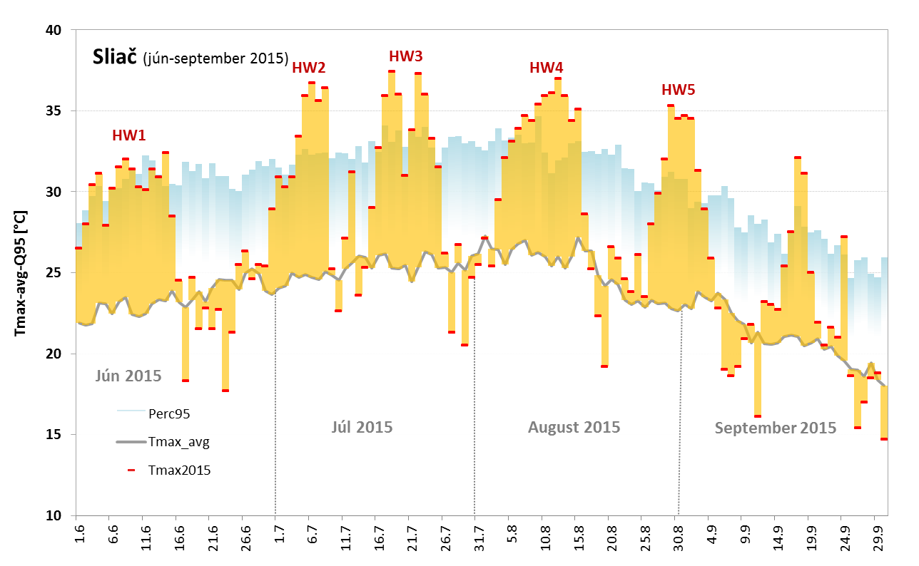 Podľa štúdie Výberči et al 2017 boli periódy letných horúčav v roku 2015 identifikované v rámci obdobia 1996-2015 tak z meteorologického ako aj bioklimatologického hľadiska (takmer 540 predčasných úmrtí) ako najzávažnejšie (najextrémnejšie). Uvedená hodnota úmrtnosti predstavuje 14 %-ný nárast celkovej úmrtnosti oproti očakávaným hodnotám. Svojimi dôsledkami bola obzvlášť pozoruhodná najmä mimoriadna perióda horúčav v prvej polovici augusta 2015 (Obr. 1). Len táto samotná dlhotrvajúca (až 14 dní; na Obr. 1 označená ako HW4, v prípade Popradu ako HW3) a perzistentná perióda vysokých denných a nočných teplôt (jedna z najzávažnejších v histórii meteorologických pozorovaní na Slovensku, prejavila sa aj v poli odchýlok mesačnej priemernej teploty vzduchu od normálu 1981-2010; Obr. 2), spôsobila vyše 240 predčasných úmrtí, čím sa stala najzávažnejšou individuálnou horúcou epizódou u nás minimálne od roku 1996. Navyše vzhľadom k pozorovanému režimu úmrtnosti v priebehu a po skončení tejto periódy možno predpokladať, že sa v jej priebehu vo zvýšenej miere mohli vyskytovať aj úmrtia odolných (zdravých) ľudí a tých, ktorých smrť sa v blízkej budúcnosti ešte neočakávala.