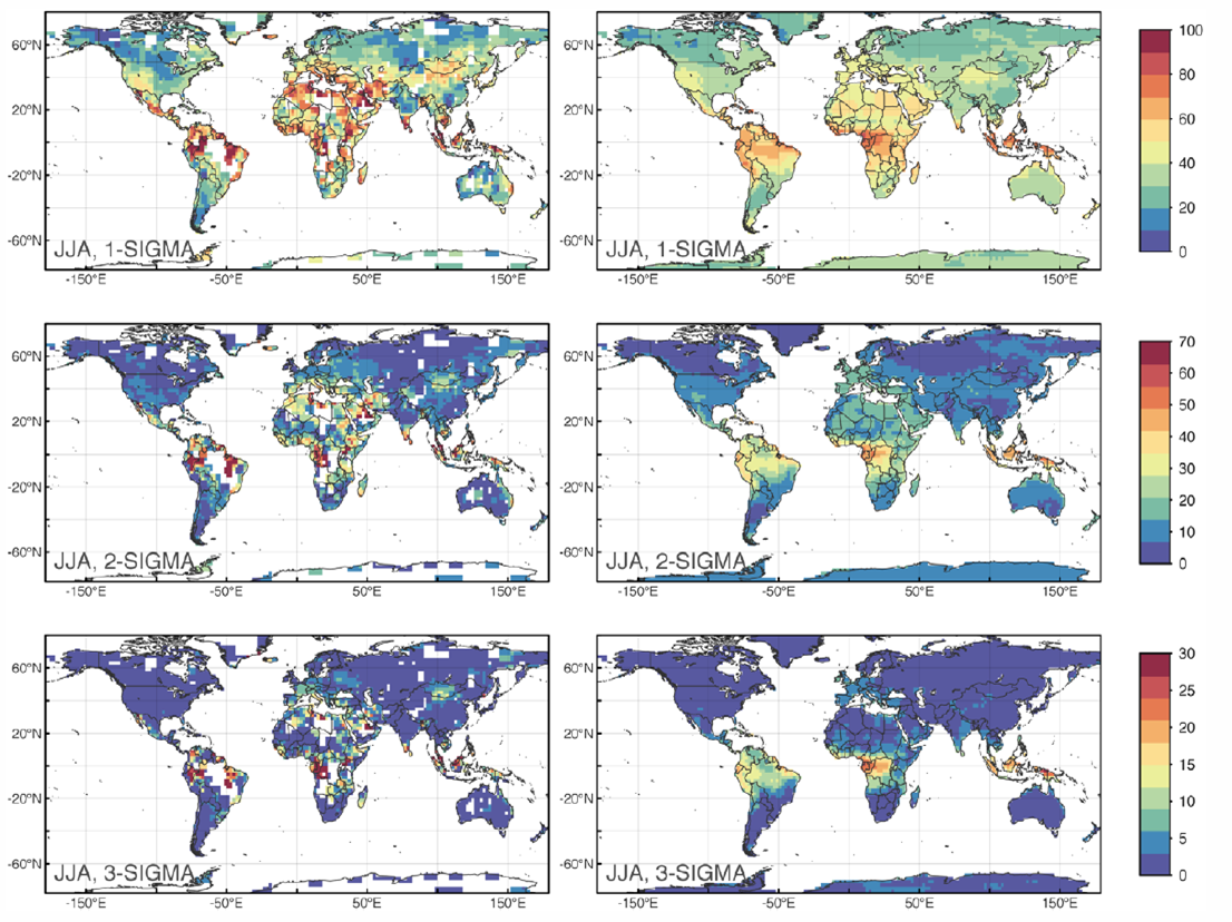 Obr. 4: Frekvencia výskytu mesačných teplotných extrémov zodpovedajúcich 1-, 2- a 3-sigma udalostí v kontrolnom období 2000-2012 podľa reálnych pozorovaní (vľavo) a modelových výstupov CMIP5 (vpravo); Zdroj: Coumou & Robinson, 2013 [Obr. 4]
