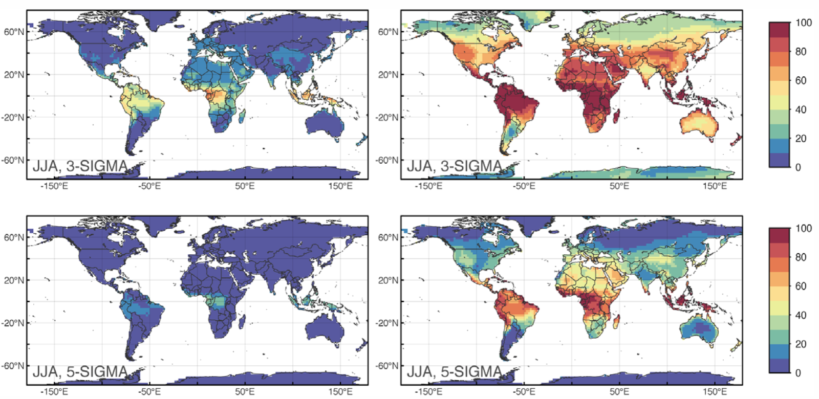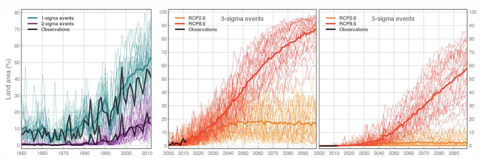 Štatistické analýzy hodnotiace extrémnosť a výskyt dlhotrvajúcich vĺn horúceho počasia poukazujú na to, že významné zvýšenie výskytu extrémne teplých periód nad prevažnou časťou pevnín súvisí s pozorovaným rastúcim trendom globálnej teploty v období posledných aspoň 50 rokov. Extrémne letné horúčavy (3-sigma), ktoré sa napríklad ešte začiatkom 60. rokov vyskytovali veľmi zriedkavo a postihovali spravidla len 1 % plochy pevnín, sa v súčasnosti vyskytujú už pravidelnejšie a zasahujú aj väčšie územie (~ 5-10 % plochy; Obr. 4). Medzi odbornými príspevkami dnes už nechýbajú ani analýzy poukazujúce na antropogénne príčiny tohto trendu (Jones et al 2008, Stott et al 2011, Stott et al 2004 alebo Schär et al 2004, a ďalšie). Otázkou preto zostáva ako zásadne sa bude v podmienkach teplejšej globálnej klímy meniť aj frekvencia, a najmä priestorový rozsah veľmi teplých periód (napr. 3- a 5-sigma udalostí). Pre tento účel autori použili výstupy mesačných odchýlok teploty vzduchu z 29 simulácií CMIP5 modelov pre dva krajné emisné scenáre (RCP2.6 a RCP8.5), pričom porovnávaná teplotná amplitúda 1-, 2-, 3- až 5-sigma udalostí bola počítaná z obdobia posledných 60 rokov (1951-2010).