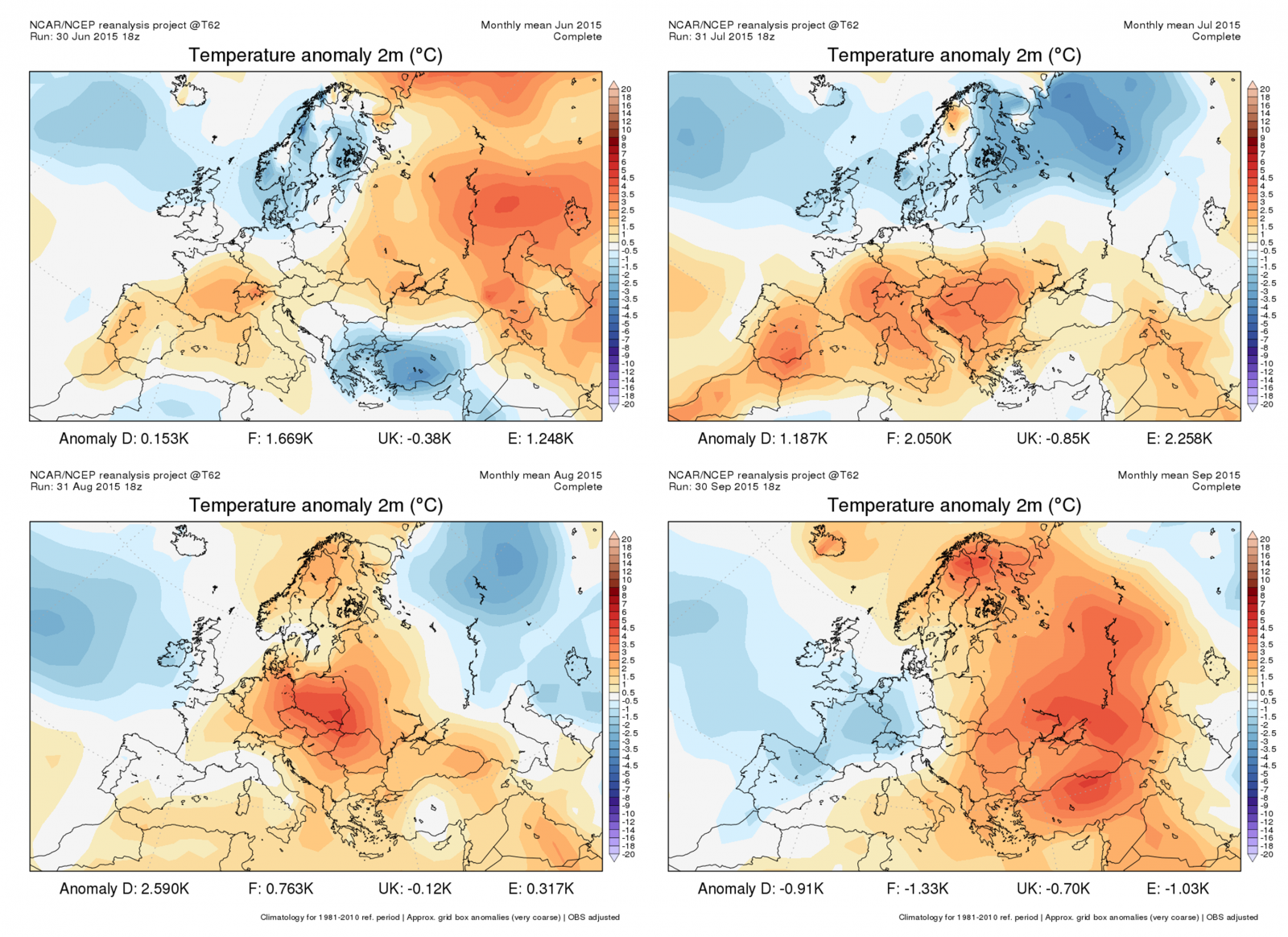 Obr. 2: Odchýlka priemernej mesačnej teploty vzduchu v Európe v júni (vľavo hore), júli (vpravo hore), auguste (vľavo dole) a septembri 2015 (vpravo dole) v porovnaní s normálom 1981-2010, podľa reanalýzy NCEP [Obr. 2]
